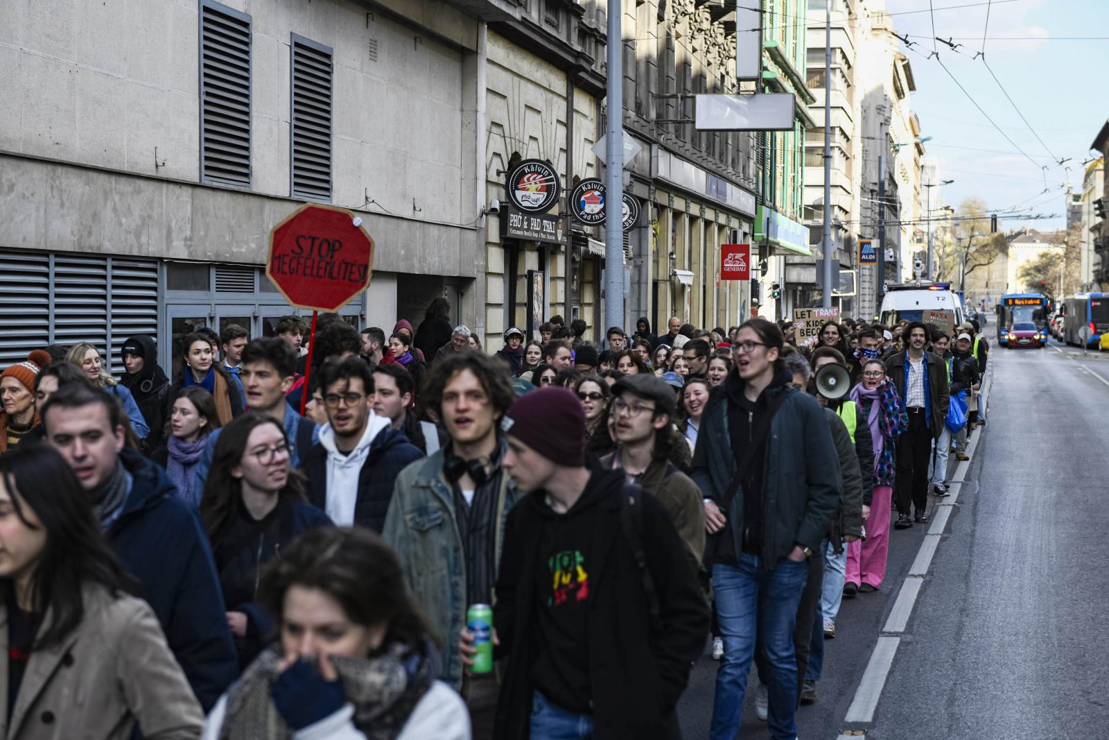 „A gyülekezés alapjog!” kiáltással jönnek a diákok, eddig a legnagyobb tömegben a tüntetésre érkezők közül. Elég masszív a bevonulásuk.