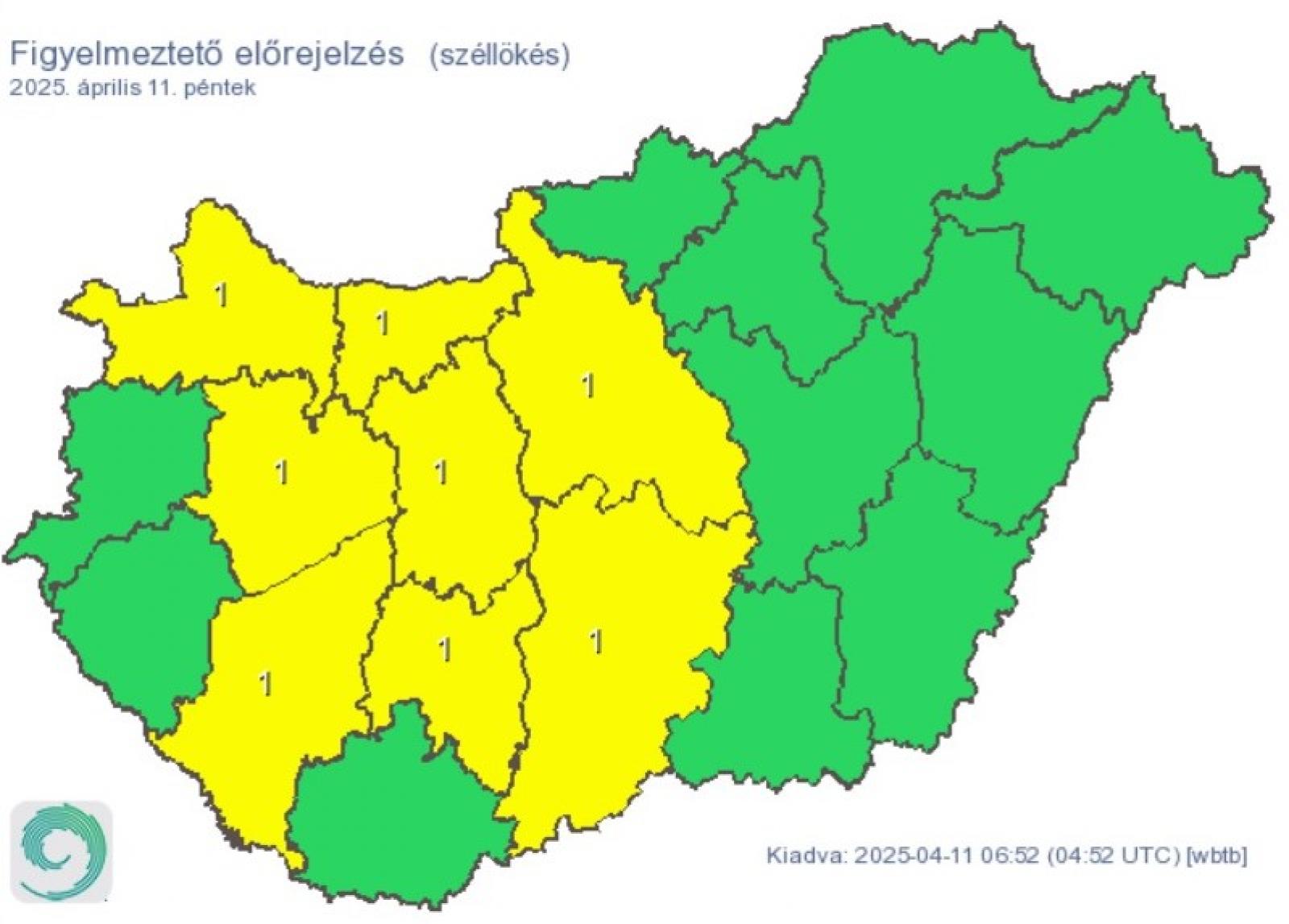 Nyolc vármegyére (Pest, Bács-Kiskun, Fejér, Győr-Moson-Sopron, Komárom-Esztergom, Somogy, Tolna és Veszprém) is elsőfokú figyelmeztetést adtak ki a szél miatt péntekre – írja a HungaroMet.