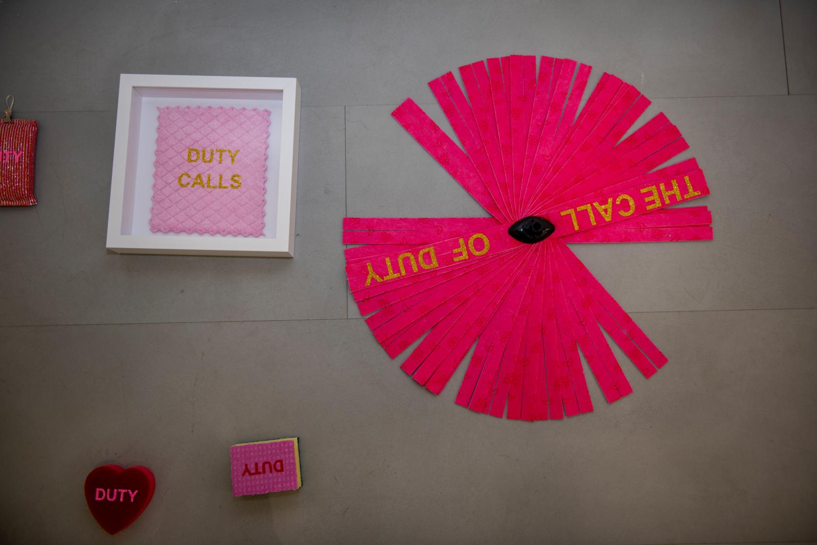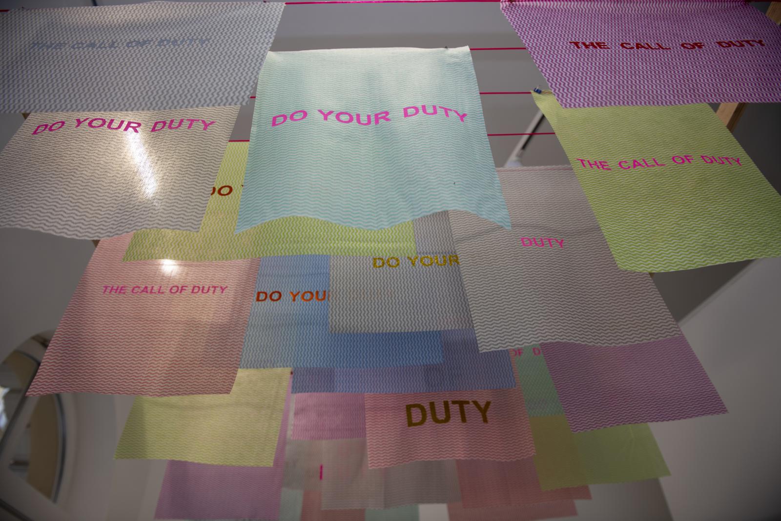 A tárlaton is ez a gondolat vonul végig, ezért is olvashatjuk a kiállított tárgyakon, köztük szivacsokon, felmosó- és törlőrongyon, bevásárlószatyron vagy partvisfejekből kirakva az angol „duty” (kötelesség), „do your duty” (tedd a dolgodat) és „call of duty” (szólít a kötelesség) feliratokat.