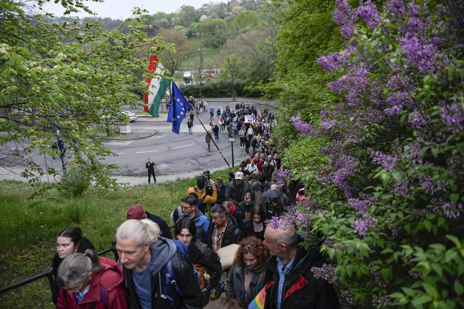 Vonulás közben már volt egy kis füstgyertyázás, az Erzsébet hídon kezdték, a Szent Gellért szobra alá kifeszített molinónál folytatták a momentumosok szirénahang kíséretében. A tüntetők a „Mocskos Fidesz!” és a „Fasiszta diktátor!” rigmusra gyújtottak rá a Karmelita kolostor felé menet. A tömeg eleje háromnegyed hétre érte el a budai Várat. Felfelé elkaptuk két fiatal panaszát, hogy alig találják meg az utat. – A szervezés egyik kulcseleme, hogy a tömeg vezetve legyen. Hát ez ma nem jött össze – állapította meg az egyikük. Fent egyébként már sokkal jobb a hangulat, mint az Erzsébet hídon. A színpadot a Sándor-palota sarkánál állították fel, az épületet rendőrsorfal védi. A Carson Coma Feldomom a követ című dalát lehetett hallani.