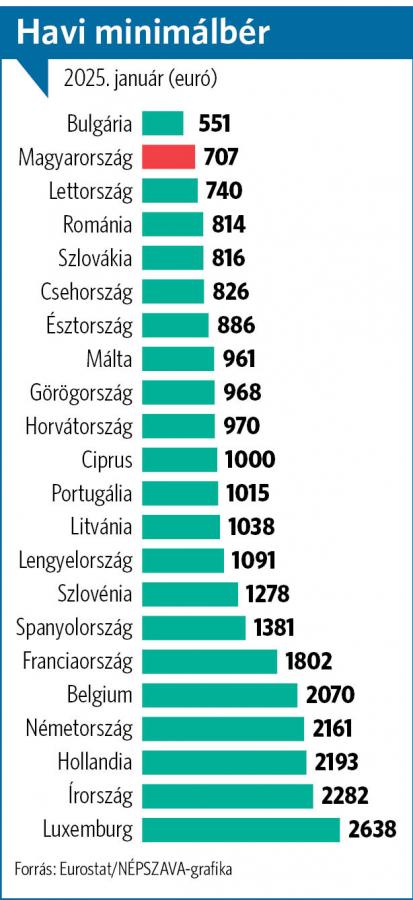 Magyarország csak az utolsó előtti az uniós tagállamok „minimálbér-versenyében” – derül ki a 2025. januárban érvényes minimálbérek összevetéséből, melyet az Európai Unió statisztikai hivatala, az Eurostat a napokban közölt. A jelenlegi hazai minimálbérrel – még a hosszú távú bérmegállapodásban rögzített számokkal is – csak Bulgáriát tudta megelőzni.