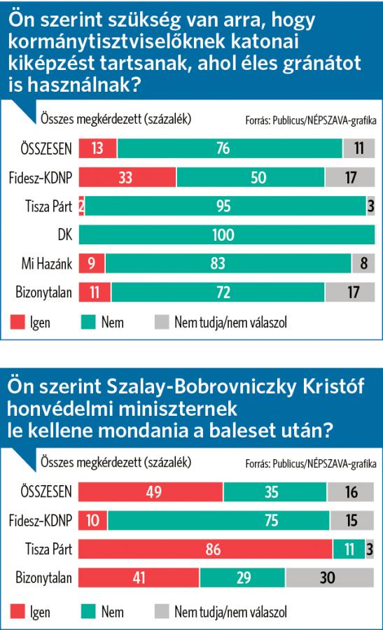 Újdörögdi baleset: vádol, de válaszokat nem ad a Honvédelmi MinisztériumÚjdörögdi baleset: felkészítés nélkül dobhatták az éles kézigránátot a kormánytisztviselőknek szánt kiképzésenMint a kutatásból kiderült, az emberek háromnegyede (76 százalék) szerint nincs szükség arra, hogy kormánytisztviselőknek olyan katonai kiképzést tartsanak, ahol éles gránátot is használnak. Csupán 13 százalék mondta, hogy szükségesnek tartja ilyen jellegű program működtetését, 11 százalék pedig nem válaszolt erre a kérdésre. A legtöbben a Fidesz szavazói között vannak, akik szerint kell ilyen kiképzés: közülük minden harmadik mondta ezt, de az ellenzékieknek csupán 2, a bizonytalanoknak 11 százaléka vélekedik így.