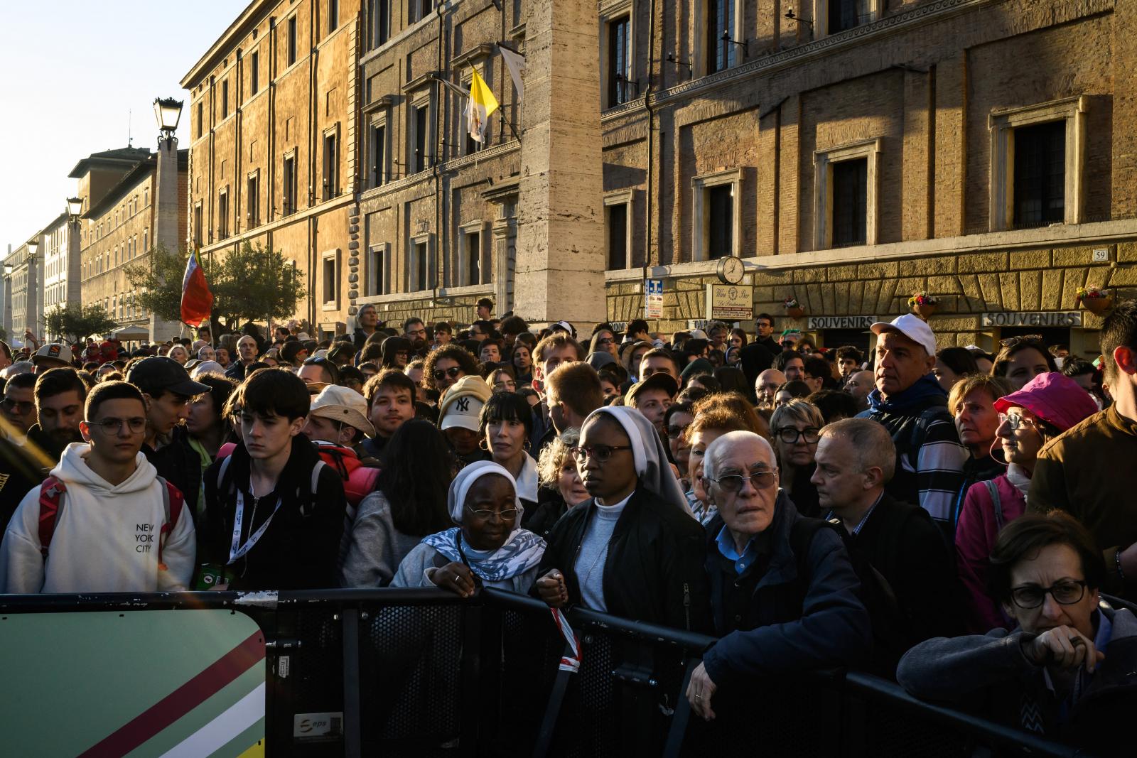 Grazie Papa Francisco! Köszönjük, Ferenc pápa! – áll Bernardo kezében a táblán. a Spanyolországból érkező férfi szombat reggel egyedül állt a tér egyik bejáratánál felállított biztonsági kapuknál. Előtte valósággal árad a tömeg minden irányból a Szent Péter tér bejáratai felé. Hivatalosan 10 órakor kezdődik a vatikáni a katolikus egyházfő gyászsertartása, de a tömeg már reggel óta megszállta a Vatikán környékét. Rengeteg pap, apáca, nagy részük ázsiai, afroamerikai.