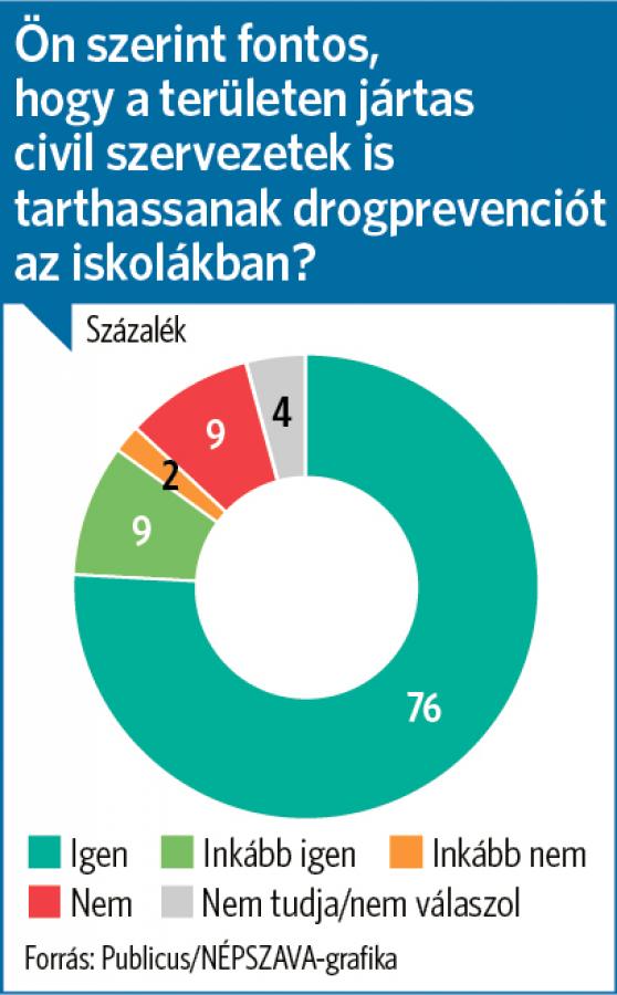 A megkérdezettek 85 százaléka szerint pedig fontos lenne, hogy a területen jártas civil szervezetek is tarthassanak drogprevenciót az iskolákban. Még a kormánypárti szavazók kétharmada, 66 százaléka, is visszaengedné a civileket, az ellenzékiek esetén ez az arány 95 százalék.
