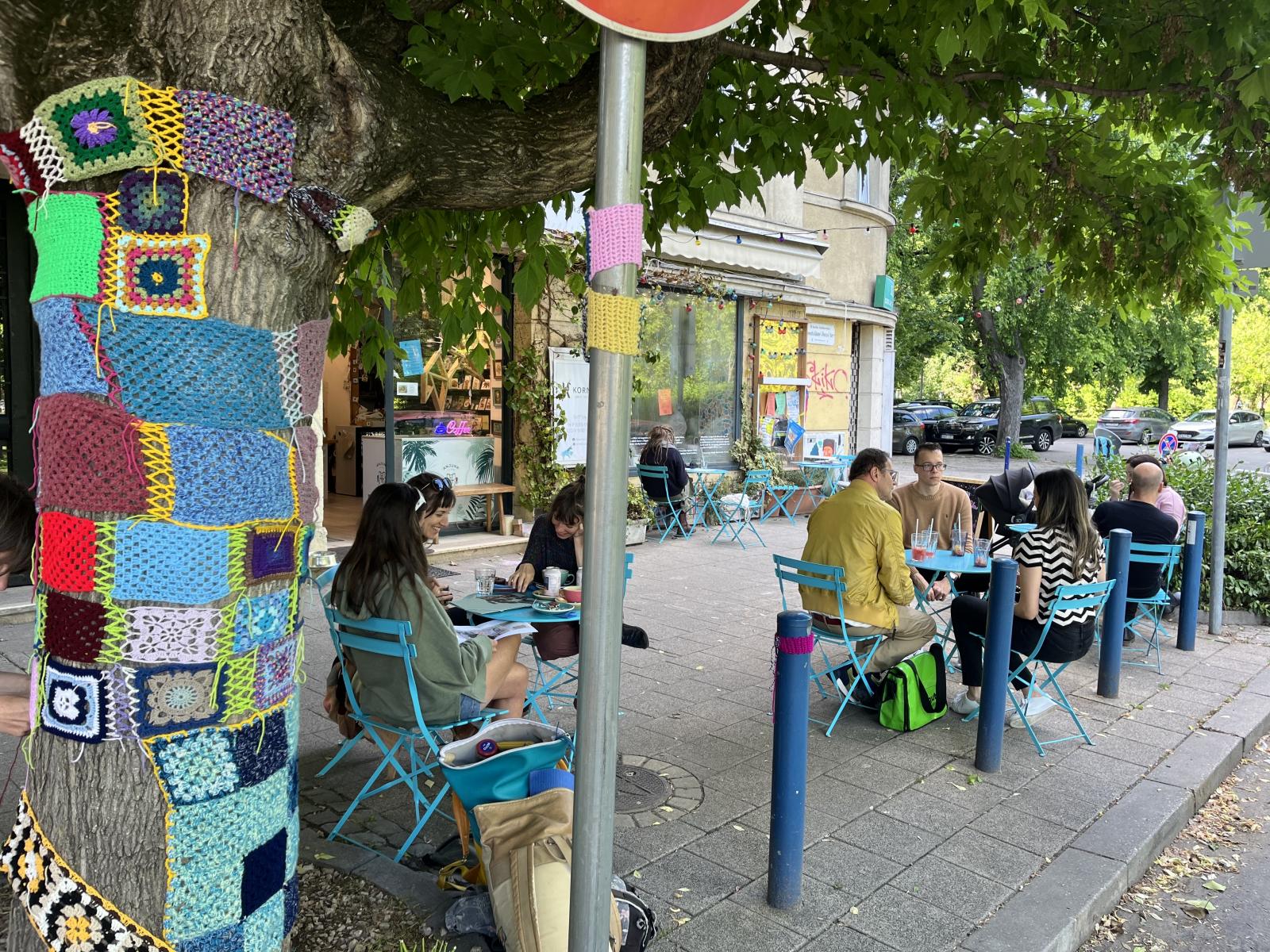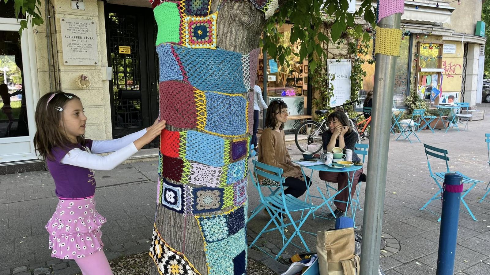 Színes, horgolt nagyinégyzetekkel díszítették a madarak és fák napján (május 10.) a budai Kosztolányi Dezső tér sarkán, a KORNÉL Galéria, Bolt és Kávézó előtt álló fát.