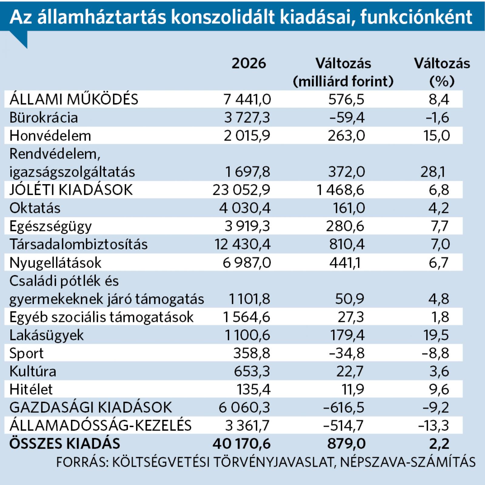 Rekordot döntött a költségvetési hiány, az NGM már jelentős zárolásokról beszélAz állami működési kiadások viszont 8,4 százalékkal növekednek átlagosan, ám ezt a bővülést a honvédelmi kiadások 15 és a rendvédelmi kiadások 28 százalékos növekedése húzza. Ez utóbbi egyaránt tetten érhető a növekvő rendőrségi, bírósági és büntetés-végrehajtási ráfordításoknál, vagyis itt a béremelések és a fegyverpénz kifizetése jelenik meg. Ugyanakkor a bürokrácia kiadásaira fordított összeg a tervek szerint 1,6 százalékkal csökken – bár ilyen tervek már sokszor voltak, ám szinte soha nem jöttek be.