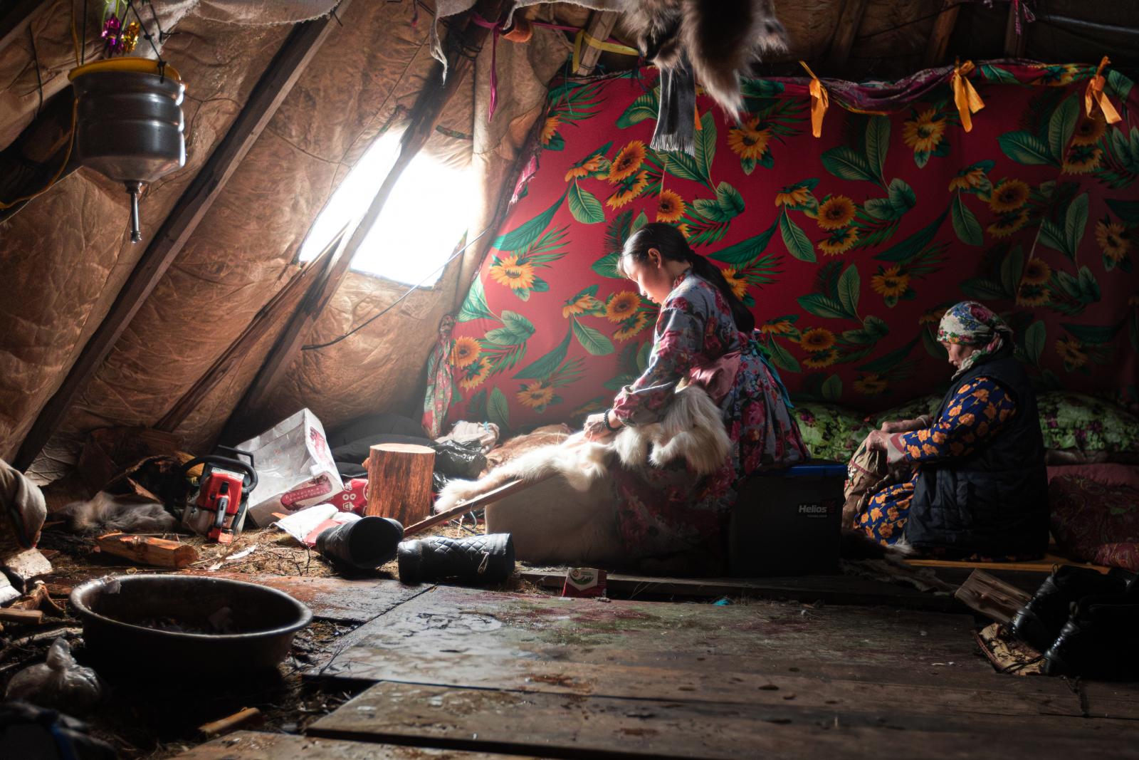A család, akikkel együtt töltöttem néhány napot, egy chumnak nevezett tradicionális sátorban él. A nagymama, két fiútestvér, a lánytestvér és az ő két gyermeke él együtt. A két gyermek édesapját sajnos az alkohol tartja fogva, és valahol a városban tengeti napjait. Ők így öten 600 rénszarvasról gondoskodnak.