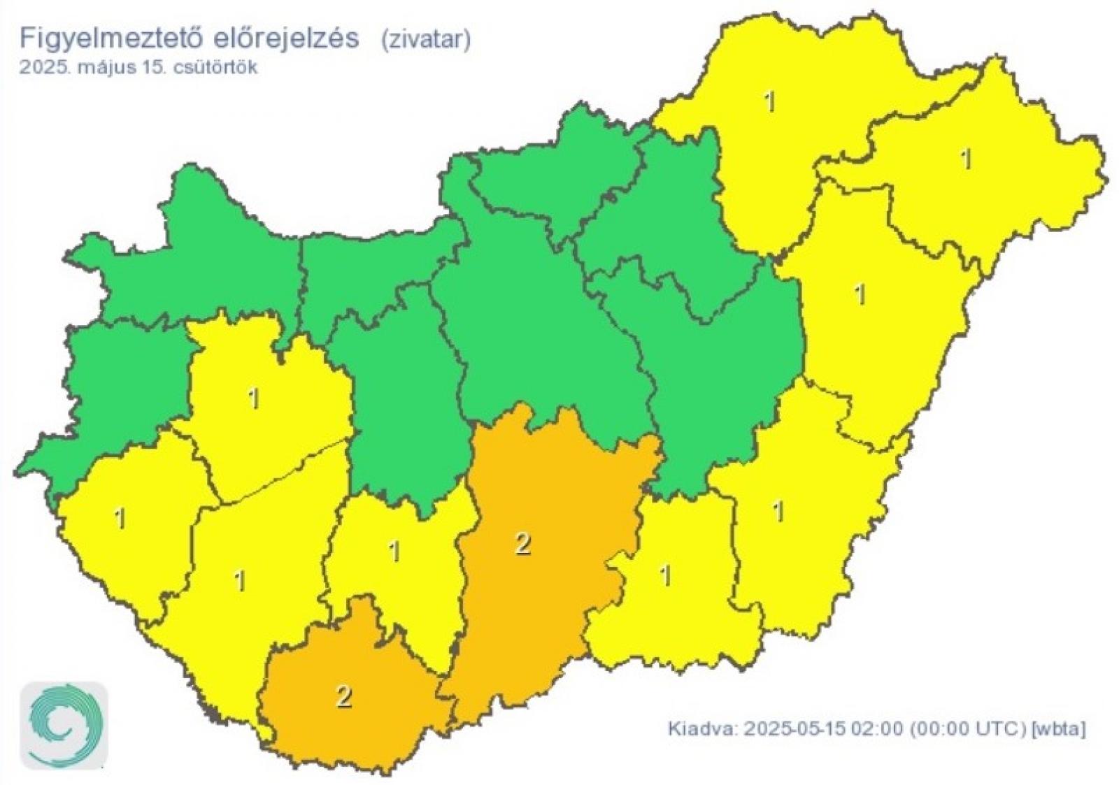A várható zivatarok miatt Baranya és Bács-Kiskun vármegyére másodfokú, míg Békés, Borsod-Abaúj-Zemplén, Csongrád-Csanád, Hajdú-Bihar, Somogy, Szabolcs-Szatmár-Bereg, Tolna, Veszprém és Zala vármegyére elsőfokú figyelmeztetést adtak ki.