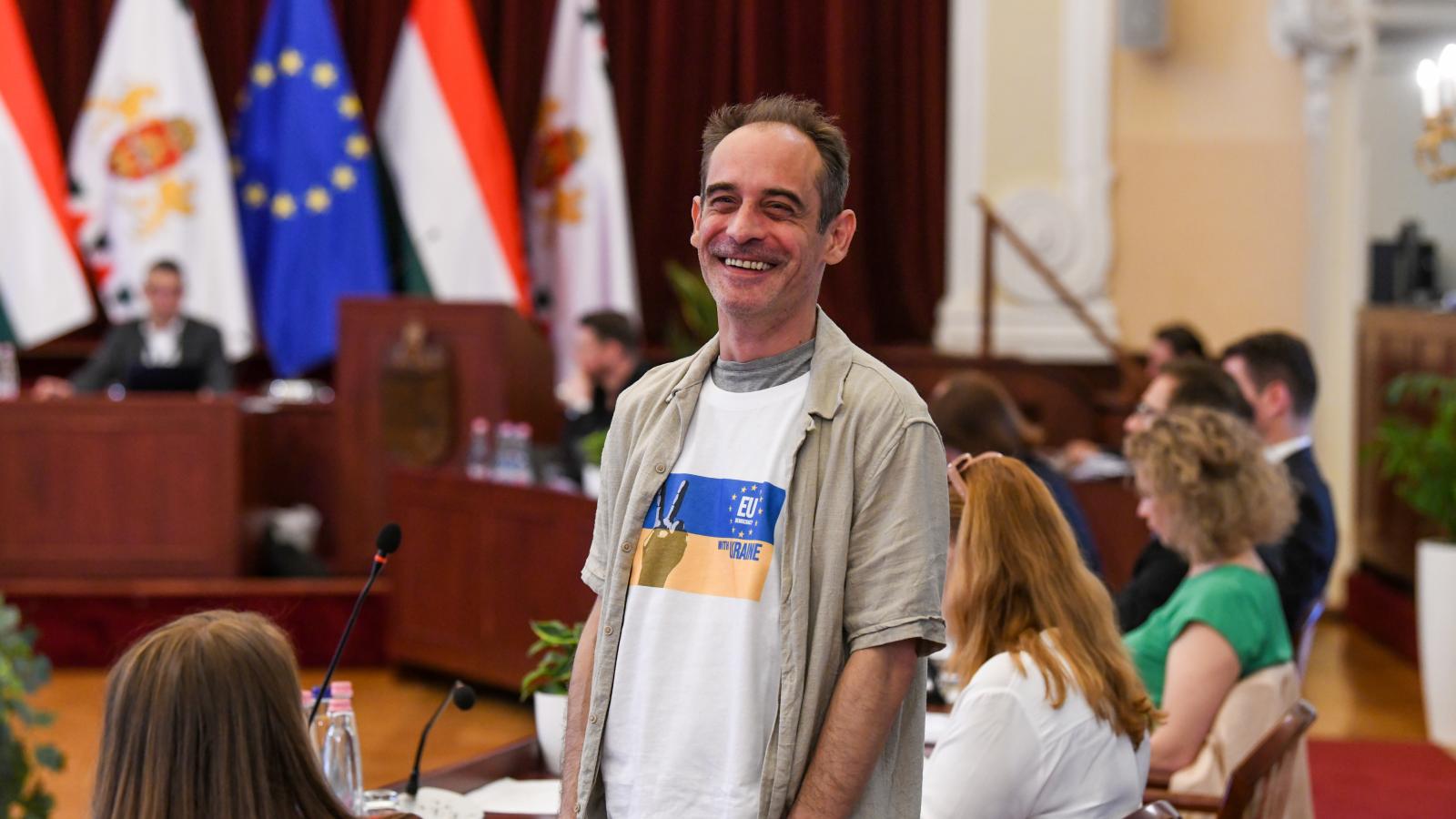 Jön az átláthatóság Budapesten is, a Fidesz szerint Karácsony Gergely ne menjen szabadságraA politikus első posztja nem sokkal délelőtt fél 11 után jelent meg. „A szokásos sorosozás, idegenérdekezés és drogosozás közben ötletes akcióra szánta el magát a Fidesz a fővárosi közgyűlésben: EU with Ukraine pólókat adtak a tiszásoknak” – számolt be. Neki sikerült megszereznie egyet a pólók közül, mivel a tiszások eldobálták azokat. A darabot azonnal felvette, és büszkén pózolt benne.