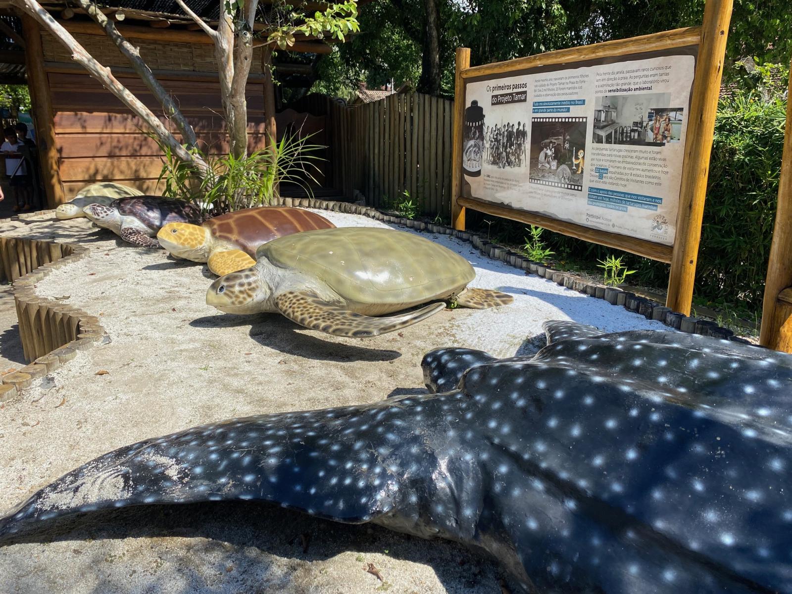 Úgy képzeltem, a náluk, velük töltött napom nagyjából abból áll majd, hogy a tengerparton szaladgálva sirályokat fogok riogatni, miközben a tojásokból éppen kikelő kis teknősök a vízbe próbálnak eljutni. Végül erre – ezúttal – nem volt lehetőségem, de a teknősmentéssel foglalkozó, 1980-ban tengerbiológusok és kutatók által létrehozott Tamar Project munkássága egyébként sem csak abból áll, hogy bébiteknősöket mentsenek éhes madarak szájából. Az ubatubai bázisukban berendezett kis tárlat szerint a küldetésük az, hogy a Brazíliában előforduló öt tengeri teknősfajt;