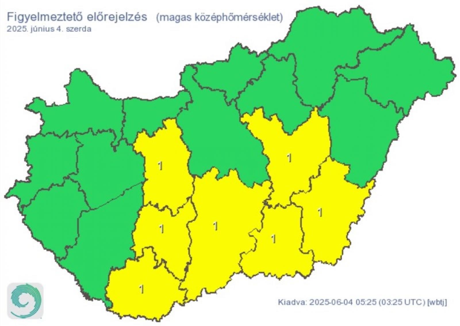 A hőség miatt hat vármegyére (Baranya, Bács-Kiskun, Békés, Csongrád-Csanád, Fejér, Jász-Nagykun-Szolnok és Tolna) elsőfokú figyelmeztetést adtak ki, az érintett térségekben a napi középhőmérséklet 25 fok felett alakulhat.