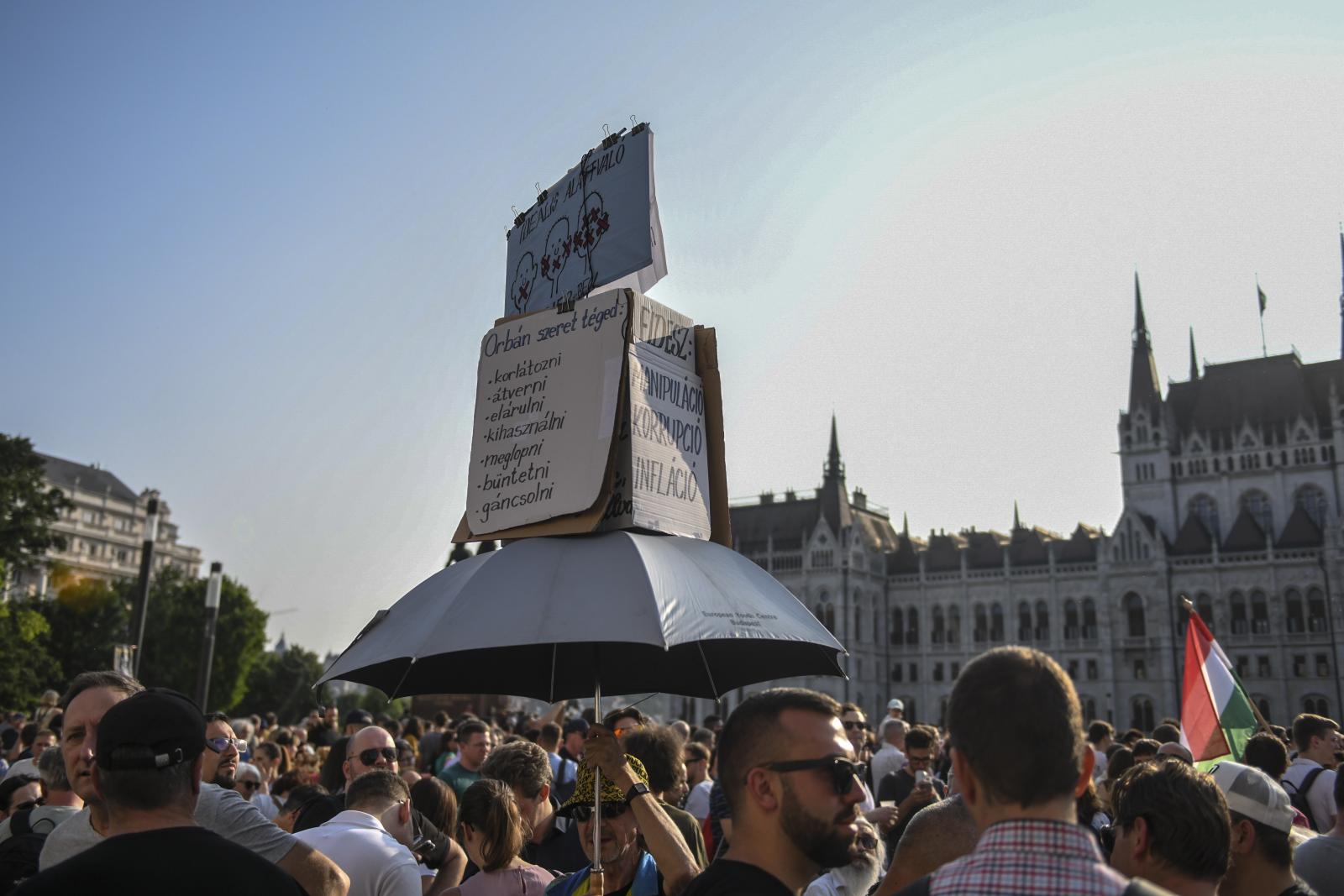 A Kossuth tér nagyjából megtelik tüntetőkkel, a 2-es villamos sínpárján is állnak már. Még mindig érkeznek emberek.