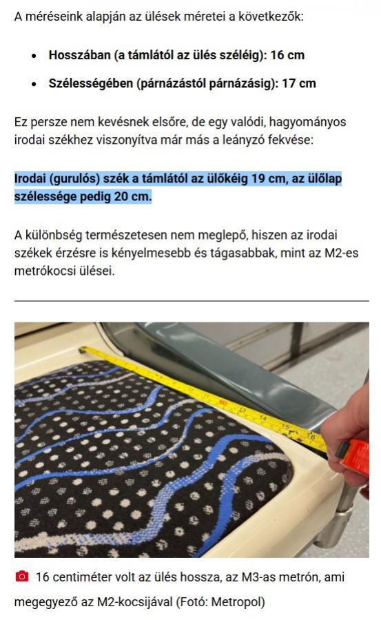 A Metropol szerkesztősége azonban nem bízott semmit a véletlenre: lemértek egy irodai széket is, amely szerintük a támlától az ülőkéig 19 cm, az ülőlap szélessége pedig 20 cm – természetesen ezek az értékek is hüvelykben értendők. „A különbség természetesen nem meglepő, hiszen az irodai székek érzésre is kényelmesebbek és tágasabbak, mint az M2-es metrókocsi ülései” – olvasható az összegzésben.
