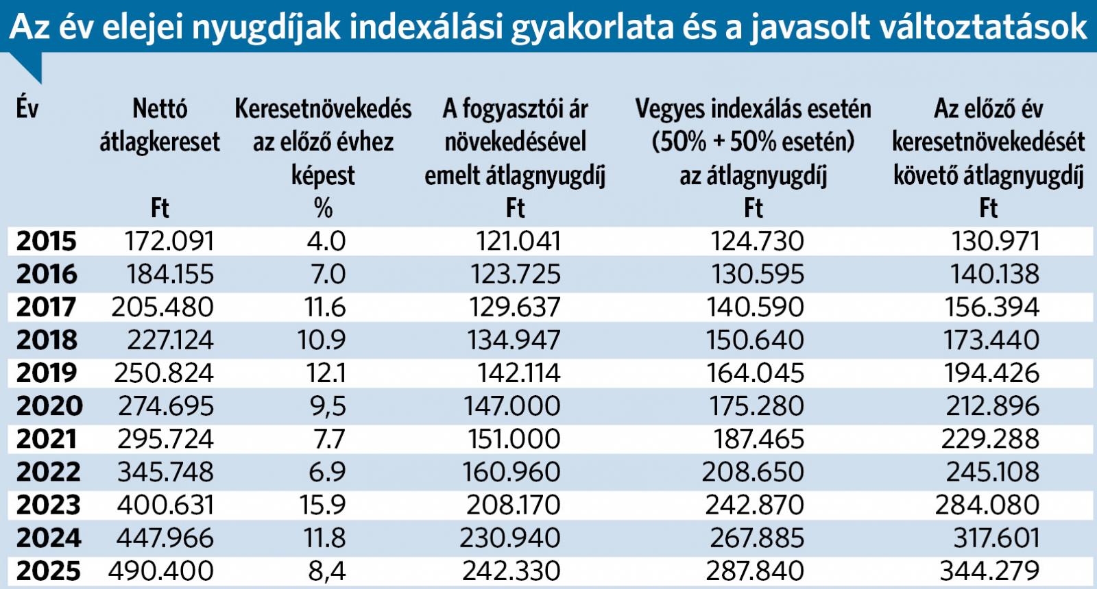 Lényegesen, 45 ezer forinttal lenne több az átlagnyugdíj, ha a kormány a jelenleg alkalmazott, kizárólag az infláció változását követő nyugdíjemelés helyett az úgynevezett svájci, vagy vegyes indexálást alkalmazná. Ha csak felerészben adná az emelés alapját a pénzromlás, a másik felét a béremelés határozná meg, a jelenleg 242 300 forint helyett 287 840 forint lenne az átlagnyugdíj.