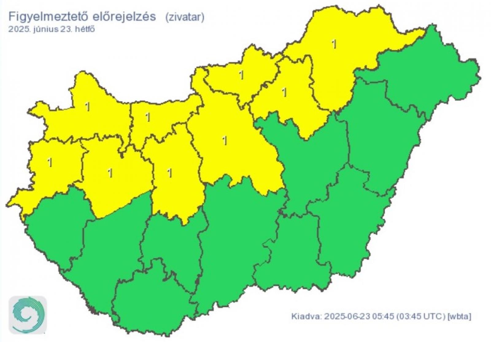 A várható zivatarok miatt kilenc vármegyére (Pest, Borsod-Abaúj-Zemplén, Fejér, Győr-Moson-Sopron, Heves, Komárom-Esztergom, Nógrád, Vas és Veszprém) elsőfokú figyelmeztetést adtak ki. Késő este jobbára 20, 28 fok közötti értékekre számíthatunk.