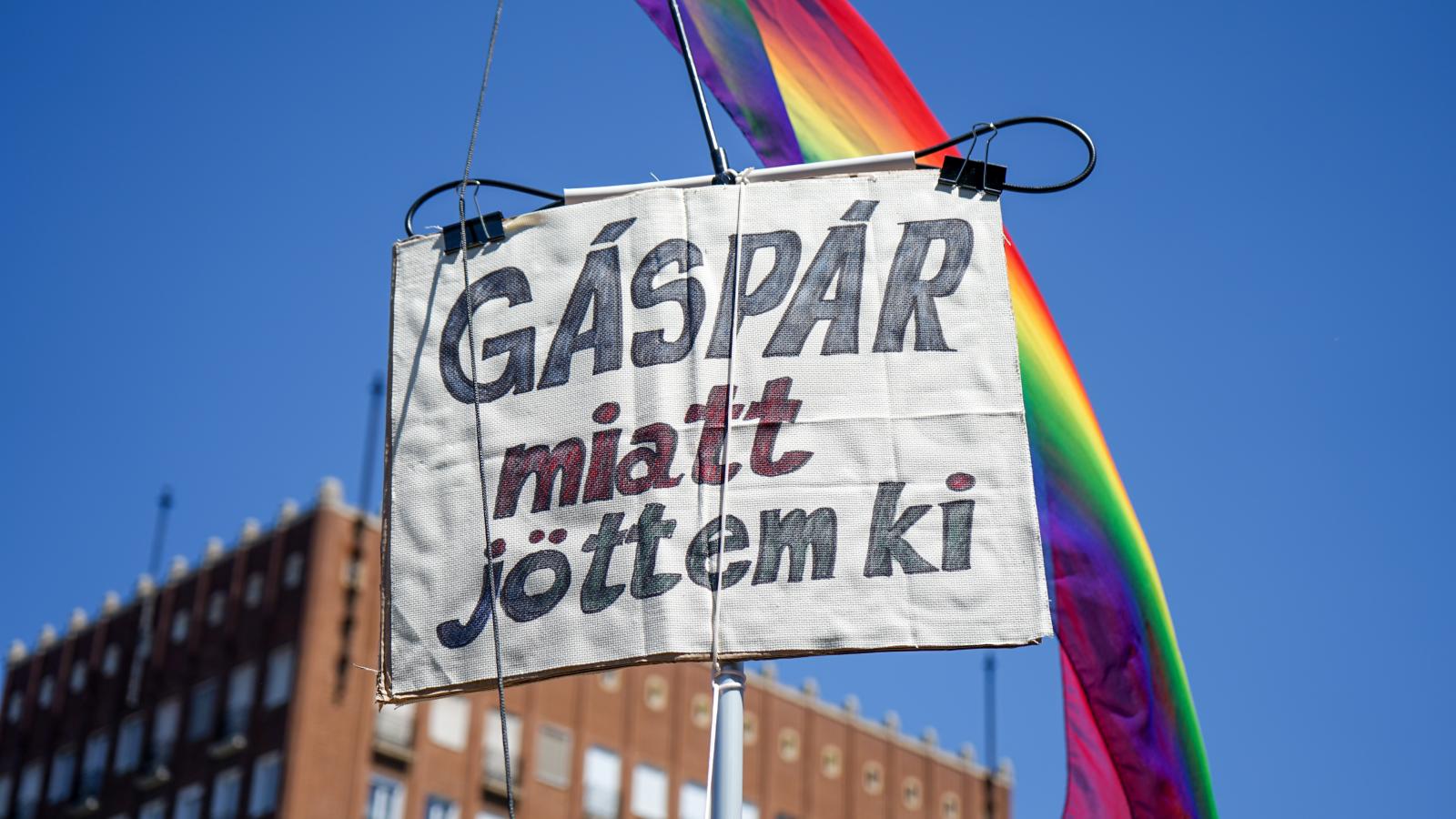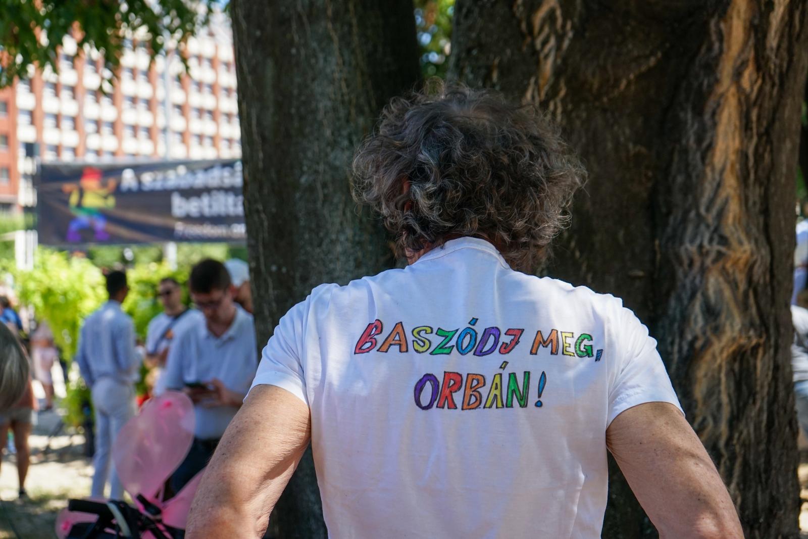 Egy „Baszódj meg, Orbán!” feliratú pólót viselő férfi egy „Gáspár miatt jöttem ki” feliratú táblával tart a felvonulásra.