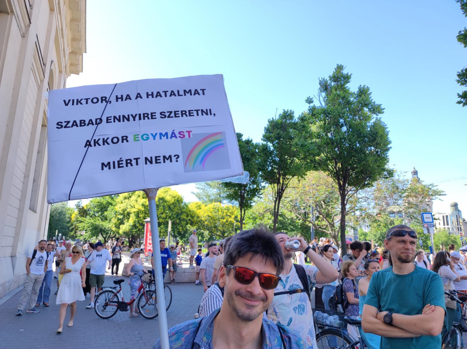 Egy férfi tudósítónknak arról beszélt, hogy ez már a sokadik Pride-ja. Szerinte így, hogy betiltották az eseményt még többeknek kell kimenni, megmutatni, hogy ezt nem szabad. Nem tart attól, hogy retorzió érheti a munkahelyén vagy rendőrségi bírság formájában. „A jogi helyzet sem egyértelmű, vitatott, én inkább hiszek a Karácsony Gergelynek ebben a kérdésben” – mondta. Bízik a szervezőkben, nem számít arra sem, hogy bárki összetűzésbe keveredik az ellentüntetőkkel, annak fényében, hogy mennyien vannak ma kint a Pride-on.