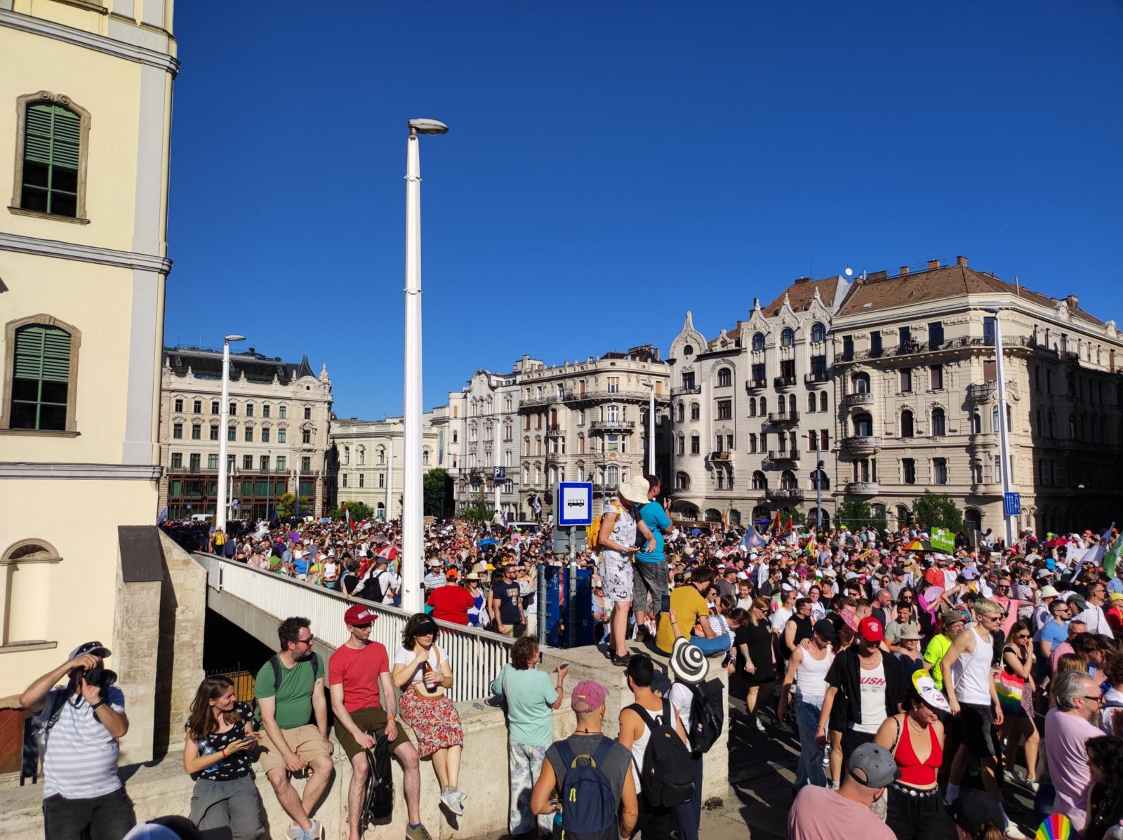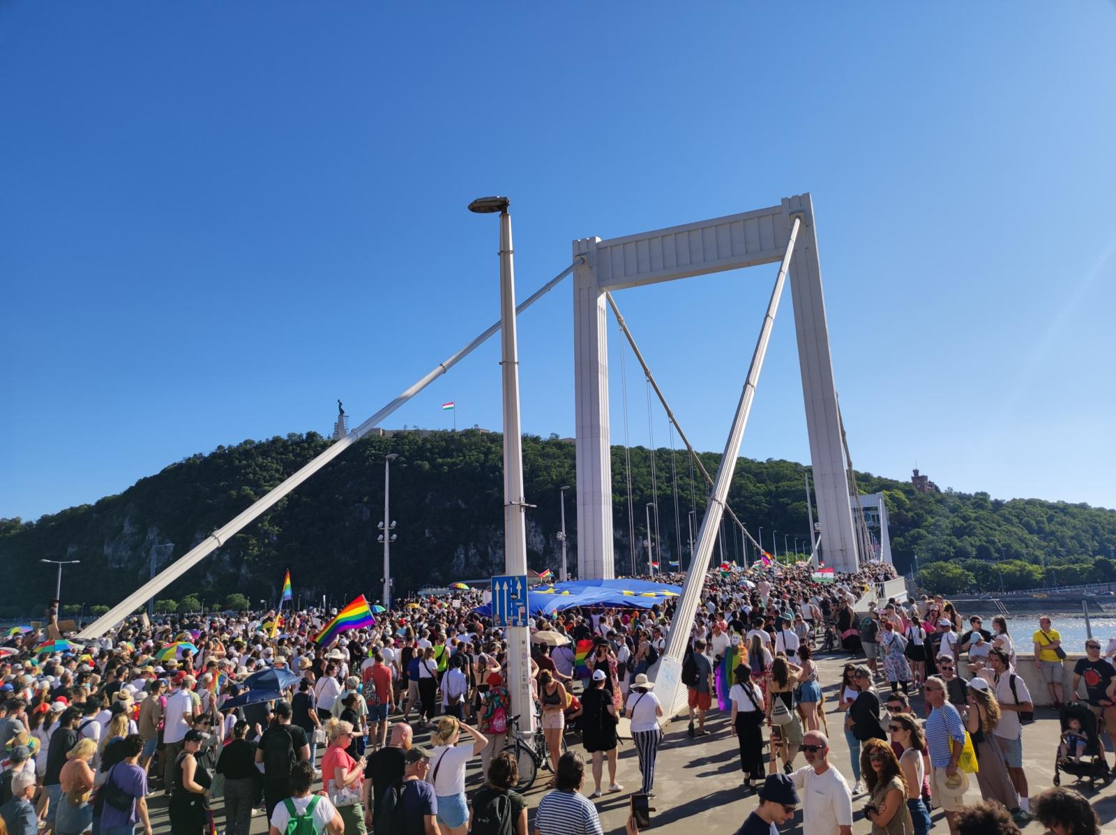 Fél hatkor még mindig kelnek át az emberek az Erzsébet hídon. A menet eleje már a Műegyetem rakpartnál van.