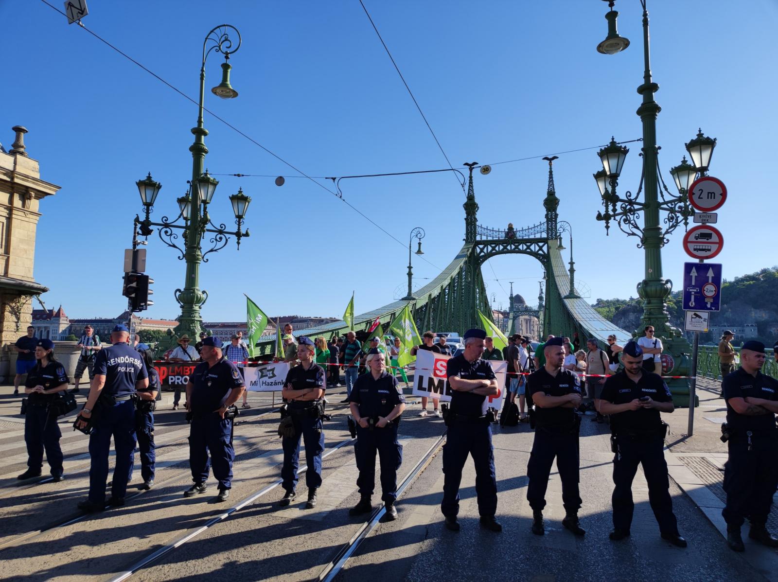 Háromnegyed hatkor egy maréknyi mi hazánkos továbbra is zárva tartja a Szabadság hidat a pesti oldalon. Masszív rendőrsorfallal védik őket. A rendőrök nem tudták megmondani, meddig marad zárva a híd.