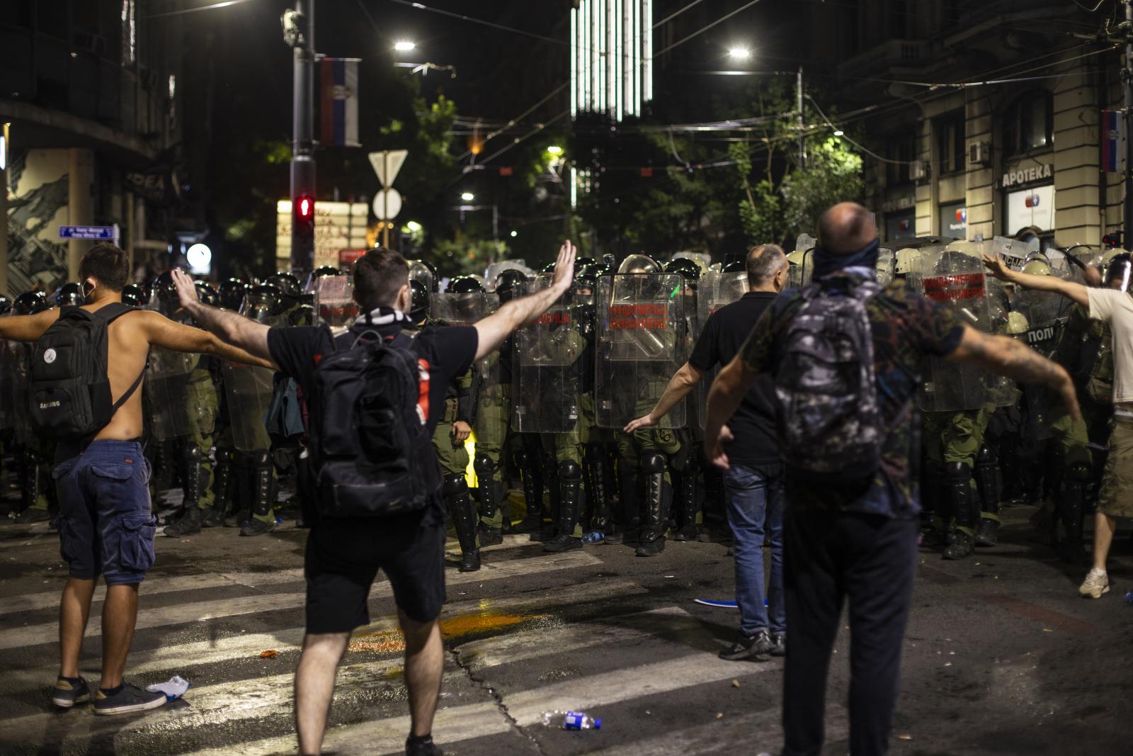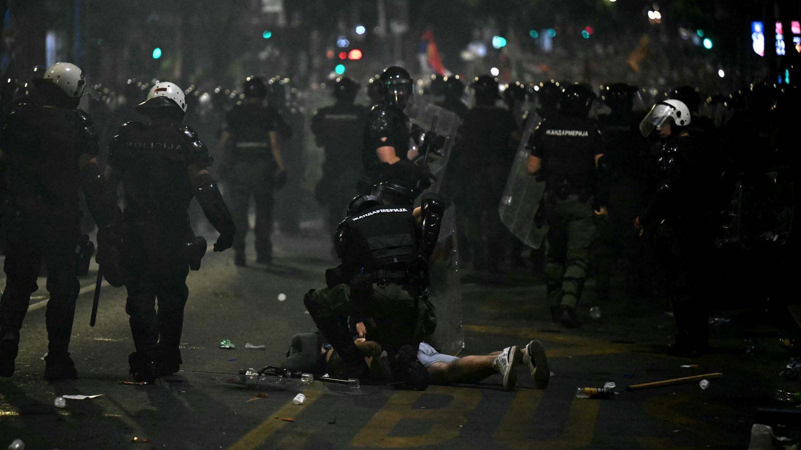 Több tucat tiltakozót állított elő a szerb rendőrség Belgrádban az éjszaka folyamán miután a szombati, kormányellenes tiltakozás összetűzésekhez vezetett, amelyek során hat rendőr és két civil sérült meg.
