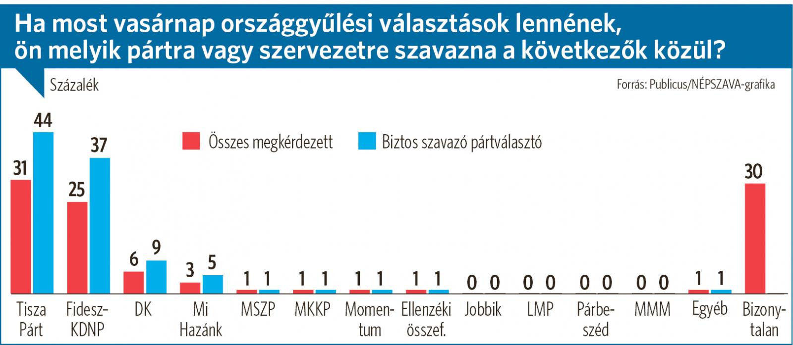 Ha most vasárnap lennének az országgyűlési választások, az összes megkérdezett 31 százaléka szavazna a Tiszára, 25 százaléka a Fideszre. A biztos szavazók körében 35-30, a biztos szavazó pártválasztókat nézve 44-37 a Tisza Párt előnye. Vagyis: kategóriától függően Magyar Péterék 6, 5, illetve 7 százalékponttal állnak jobban – ez derül ki a Publicus Intézet lapunk megbízásából készített friss felméréséből.