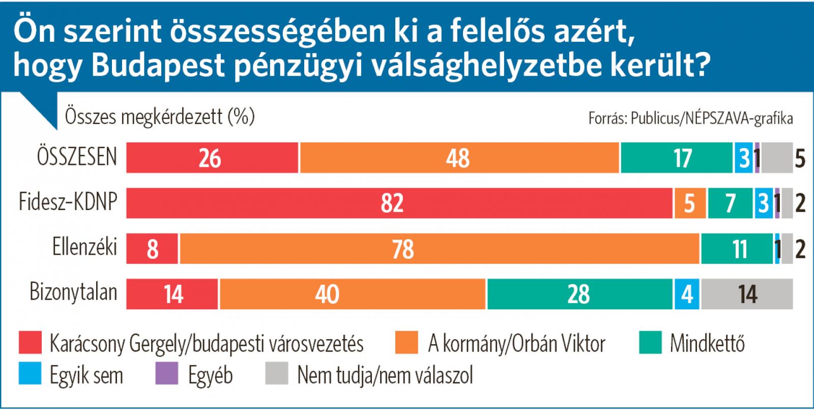 Megszavazták a módosított költségvetést a Fővárosi KözgyűlésbenAz már sokkal megosztóbb kérdés, hogy ki a felelős Budapest pénzügyi válsághelyzetéért. De még ezzel együtt is összességében csaknem kétszer annyian (48 százalék) mondták azt, hogy a kormány okolható ezért, mint ahányan a városvezetést hibáztatják (26 százalék). A Fidesz szavazóinak 82 százaléka aligha meglepő módon a Karácsonyékat okolja. Az ellenzéki voksolók 78 százaléka viszont Orbán Viktort látja emögött. A válaszadók 17 százaléka szerint mindkét fél sáros az ügyben. A fővárosiaknak 65 százaléka okolja a kormányt, a vidéken élőknek kevesebb, mint a fele, de ők is relatív többségben vannak ezzel a véleménnyel. A nyomásgyakorlással azonban nem árt óvatosnak lenni. A megkérdezetteknek kevesebb mint harmada gondolja csak azt, hogy ez a helyes út, 58 százalékuk inkább egyezkedne a kormánnyal.