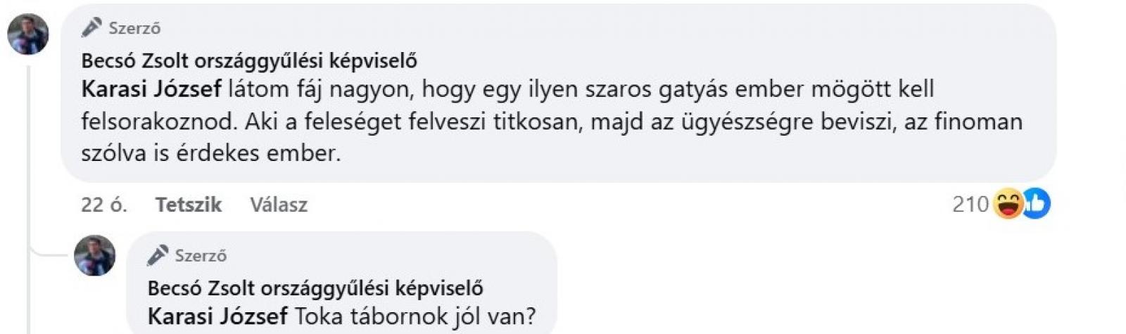 A kommentmezőben aztán elszabadult a pokol. „Biztos Szájer helyében akarsz lenni! Bese atya áldásával” – jegyezte meg valaki, amire a politikus nem volt rest válaszolni. „Látom, fáj nagyon, hogy egy ilyen szaros gatyás ember mögött kell felsorakoznod. Aki a feleséget felveszi titkosan, majd az ügyészségre beviszi, az finoman szólva is érdekes ember” – fogalmazott, majd egy újabb kommentben a következőt fűzte hozzá a gondolatmenethez: „Toka tábornok jól van?”.
