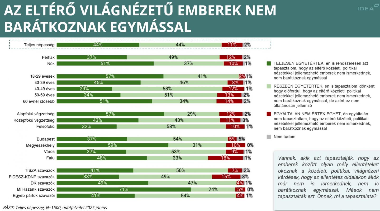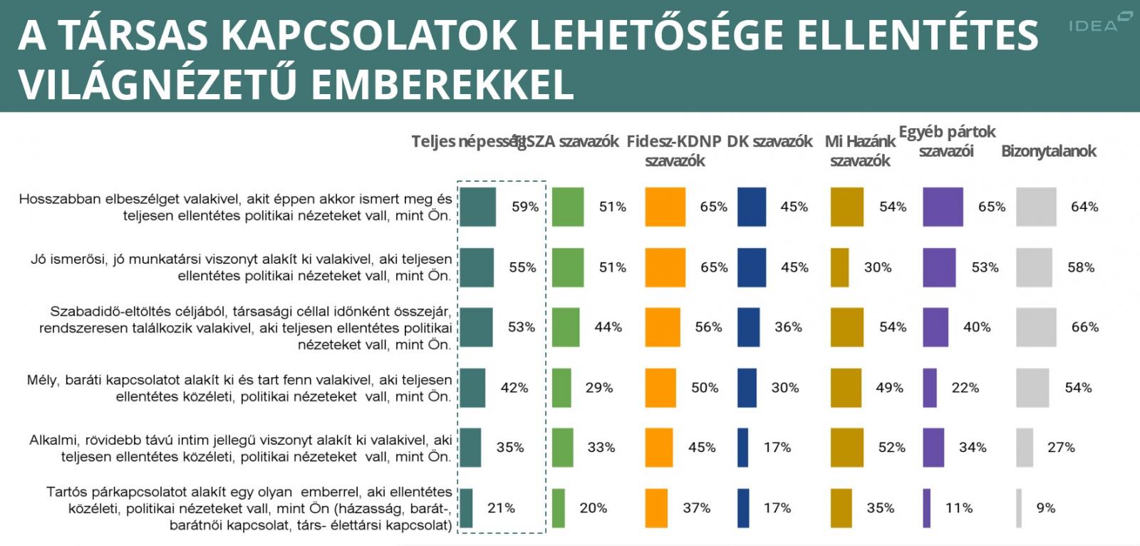 Az Idea Intézet összegzése szerint a világnézeti és politikai megosztottság jelentős távolságokat okoz a magyar felnőtt lakosság mindennapi kapcsolataiban, és a legtöbb kapcsolat továbbra is az azonos gondolkodásúak között alakul ki.