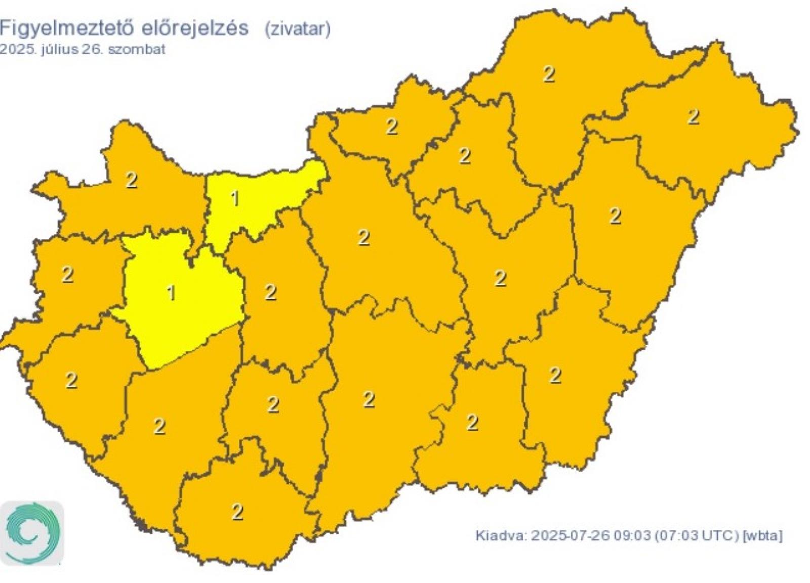 A várható zivatarok miatt Komárom-Esztergom és Veszprém vármegyében elsőfokú, az ország többi részén másodfokú figyelmeztetések vannak érvényben, miközben felhőszakadásra is országszerte számítani kell.