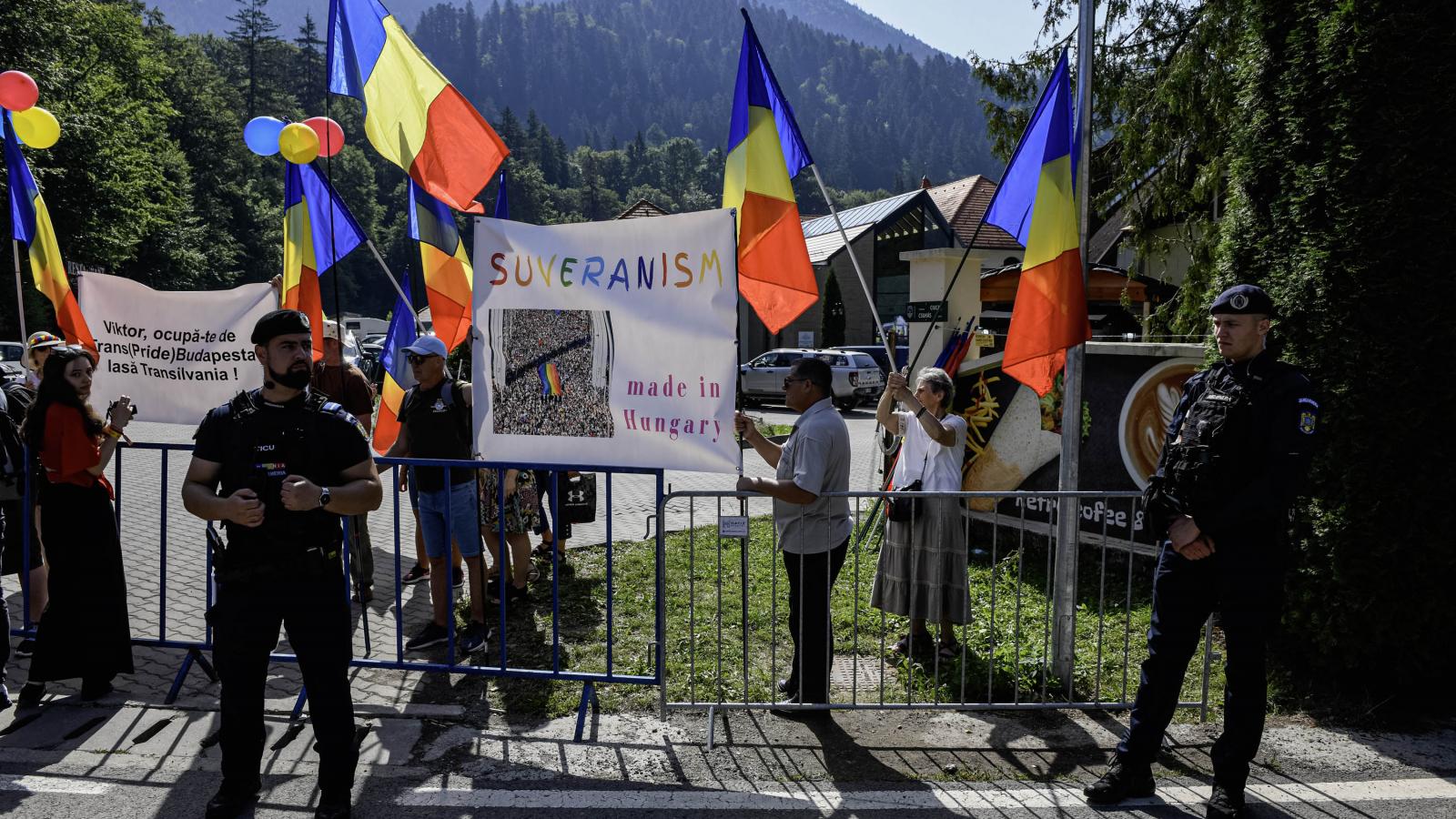 Erről tanúskodnak legalábbis annak a maroknyi tüntetőnek a transzparensei, akik a 34. Bálványosi Nyári Szabadegyetem és Diáktábor bejáratánál demonstrálnak. „Szuverenizmus?” – kérdezi egy szivárványszínű felirat az egyik transzparensen az Erzsébet hídon lobogó zászlóval. Egy méásik transzparens arra szólítja fel Orbán Viktort, hogy hagyja már Erdélyt.