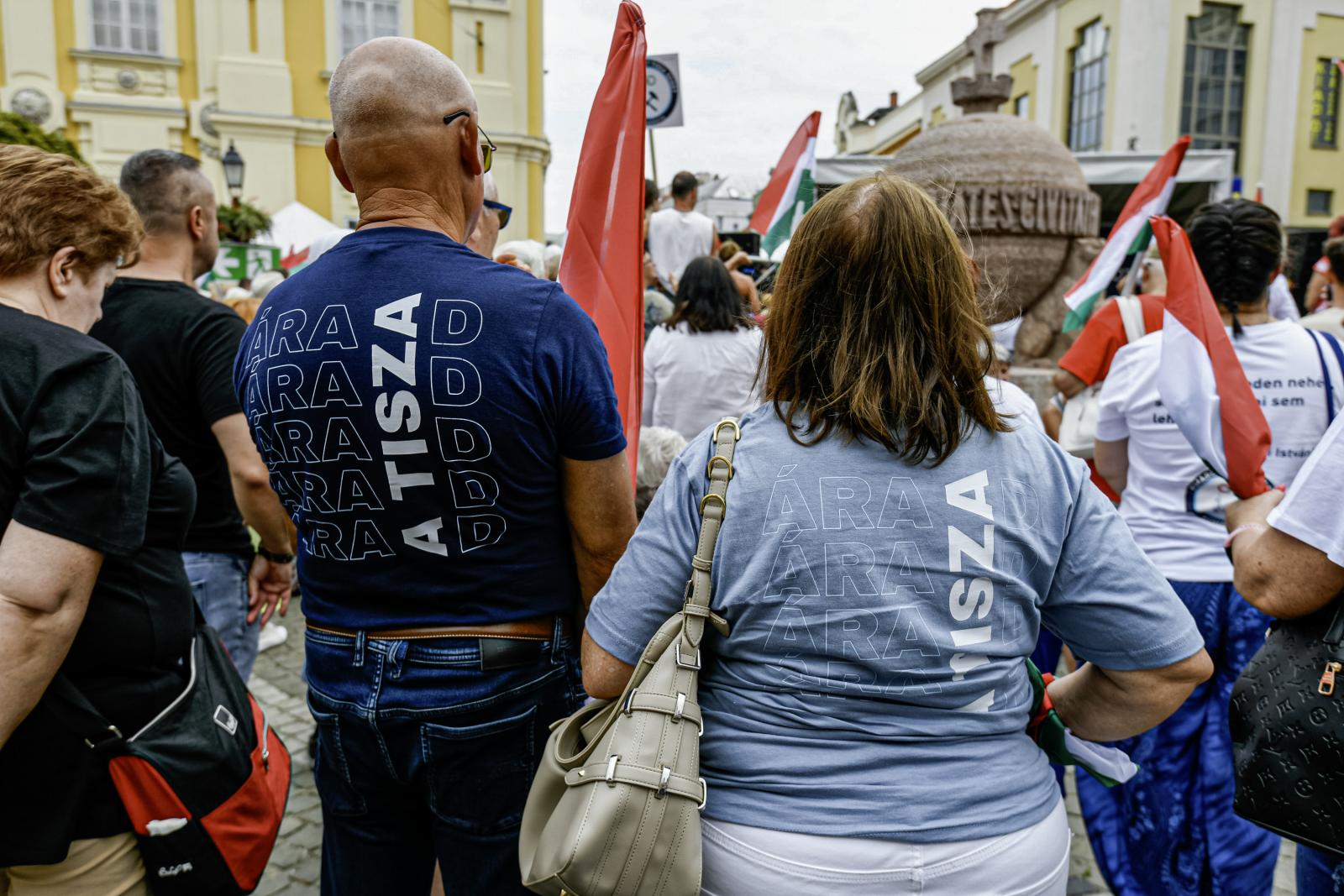 A Városház téren körülbelül négyezren állnak, hallgatják, mit mond Magyar Péter a hazájuk helyéről világban, a tömeg egy része csak a környező utcákban fér el. Tiszás ajándéktárgyat nyomott áron lehet kapni, kérdésünkre pedig, hogy miért, egy árus azonnal lecsapja a magas labdát: – Hogy kedveskedjünk maguknak! Azt is megtudjuk, hogy a nagyobb termékeket, például a tiszás széldzsekit nem nagyon viszik, szinte mindenki karkötőt vesz, de egy csapat dél-koreai turista speciel magyar zászlóval csörtet a Városház téren. Faggatózunk egy kicsit, kiderül, hogy ezeket a tömegben ingyen osztogatták. Ezen túl a dél-koreaiak nem sokat fogtak fel az egészből: arra gyorsan rájöttek, hogy valami politikai rendezvényen járnak, de ezen túl – állítják –, nemhogy Magyar Péterről, Orbán Viktorról sem hallottak még soha.