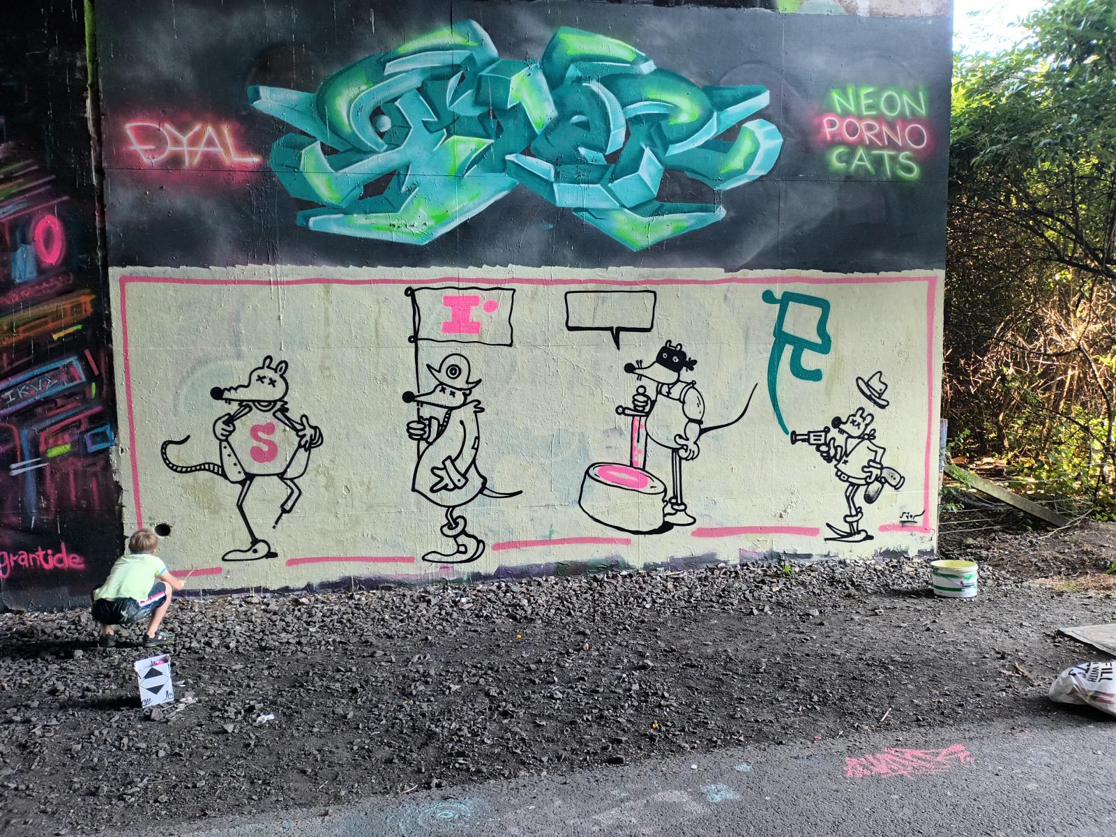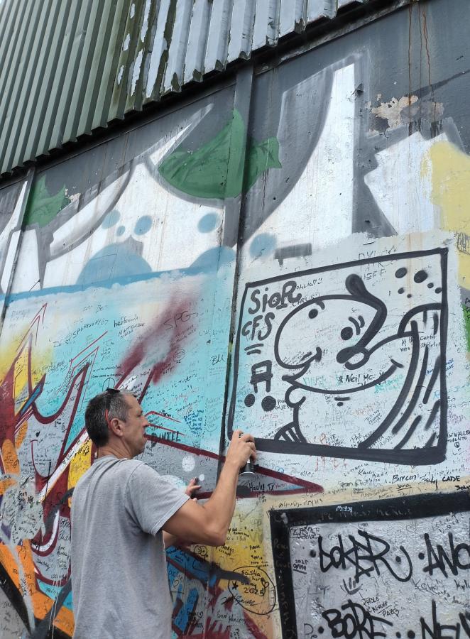 Ahogy sétálunk, elmondja, hogy az egyik rész a festésnek van, de a büfé melletti újonnan fehérre meszelt részre csak filcet szeretnének, mert ide az üzeneteit írja az a látogatócunami, amely naponta ingázik a belváros és a kerület között. Üzenetek százezrei tarkítják a falat, a fehérre kent részt is, de a graffitikre is firkáltak sokan filcekkel. Nézem a graffitis falat, jó pár nagyágyút ismerek az Instagramról, erős a felhozatal. A családomnak odaadom a filces zsákot, én fogom az egyetlen fekete sprémet, nem akarok brillírozni, csak valami kis egyszerűt. Alkalmi partnerem felajánlja, hogy csinál pár fotót rólam, elveszi a telefonom, megint meggyújtja a cigijét és nekilátunk. Egy perc alatt megfestem a kis emberkémet arra az apró helyre, ahol nem volt másnak munkája, bedobom a sprét a hátizsákomba. Új barátom mellé állok a falnál, nézzük a semmit, jól esne egy slukk a cigiből, de erősen szuggerálom magam, ez csak illúzió, nem lehet csalni, azonnal visszaszoknék.