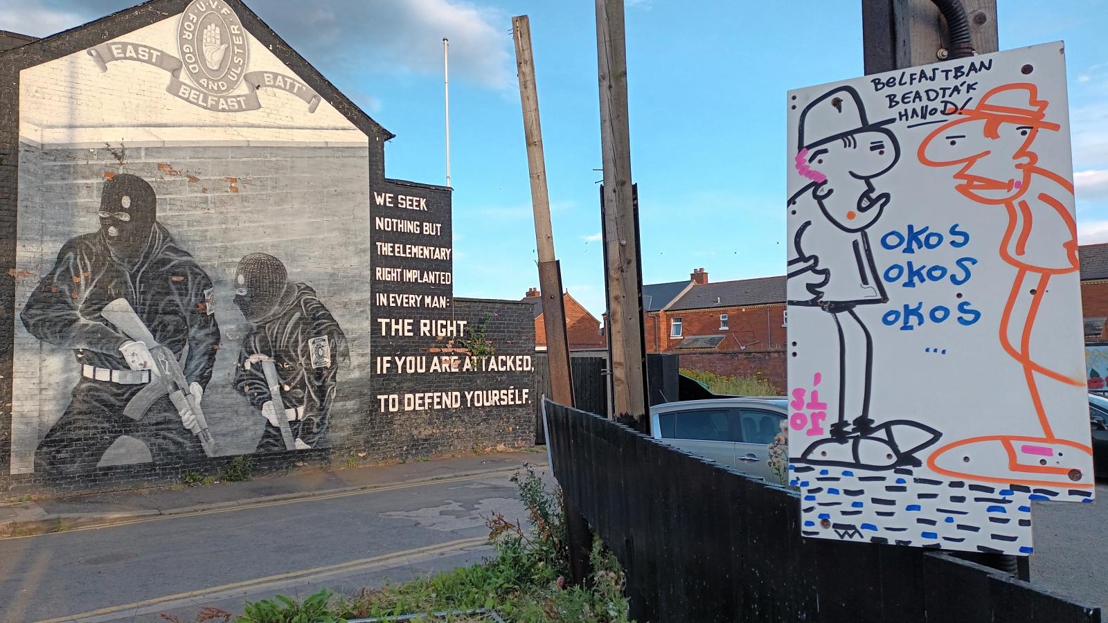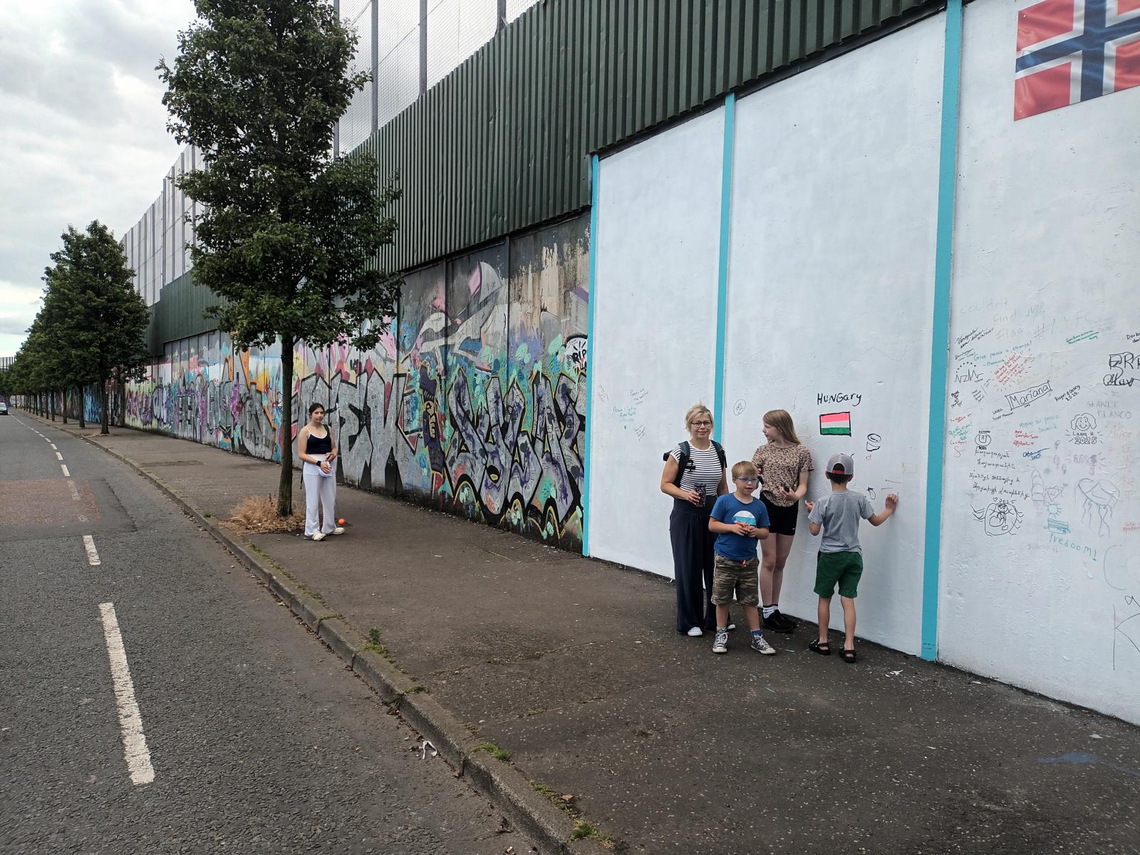 Belfast belvárosa után, ahol csodálatos negyedekben, sikátorok, madárszigetek, hatalmas köztéri szobrok és modern épületek sorakoznak, ez a negyed szinte sokkolt. Először is, szinte senki nem volt az utcákon. A foghíjtelkeken tonnaszám a szemét, egy összefirkált híd alatt pár arc tűz körül szívta a krekket, mellettük sátrak. A sűrűn épült sorházak, hatalmas falak mögött lapultak, csak a tetők látszanak ki. Barátom leírásából azonnal felismerem, ez lesz a szabad ír rész, fenn a dombokon. Elkezdünk visszafelé menni és észrevesszük a Béke Falat, ami a célunk volt. A fal hármas osztatú, alul beton, aztán fém, majd rács a tetején. Azért épült így, mert először csak fém fal volt, de azon átlőttek, aztán amikor odakerült a beton válaszfal, akkor azon meg átdobták a köveket és bombákat. Végül ez a struktúra alakult ki, átlőhetetlen és átdobhatatlan kivitelben.