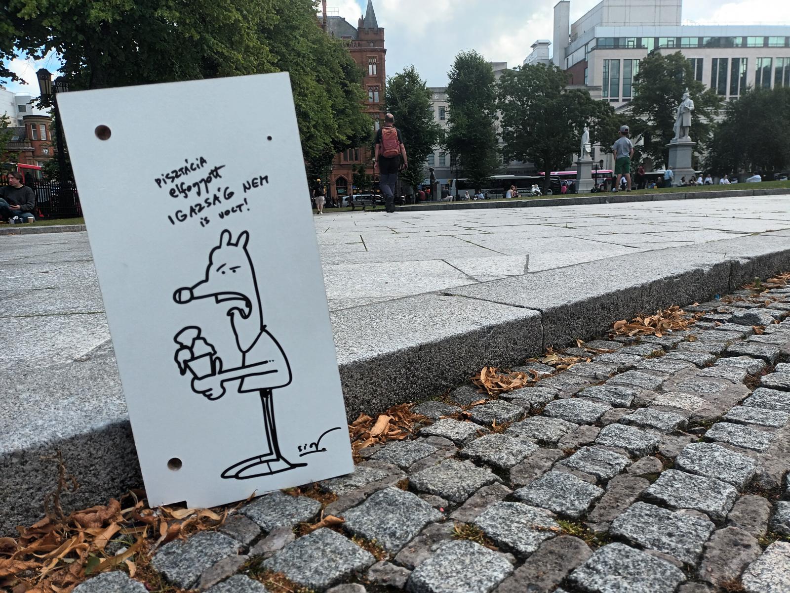A harmadik napon a feleségem javasolta, hogy fizessünk be egy városnéző buszos túrára. Első reflexből azonnal arra gondoltam, micsoda kispolgári attitűd ez, de aztán arra jutottam, nem kell mindig a punkot játszanom. Ahhoz képest, hogy milyen gondolataim voltak gyerekvállalásról vagy kulturált borfogyasztásról, rendezett napirendről korábban, már megtanultam, hogy nem kell mindent azonnal csuklóból elutasítani. A busz a belvárosból indult, és meglepetésemre nagyon tetszett a dolog. A túra lényege, hogy bármikor és bárhol le lehetett pattanni a buszról, majd a következő járműre megint fel, s eszerint meg lehetett nézni a városban a palotákat, ginlepárlót, börtönmúzeumot, hajókat, Titanic múzeumot, mindent. Mi arra jutottunk, hogy a nagy falnál, a Béke Falnál szállunk le először, ami a polgárháború alatt elválasztotta a két oldalt. Rita már volt itt, azért is mondta, rám gondolva, hogy ez legyen az első. Jelzünk. Semmi. Nézem Ritát, de a busz csak robog tovább velünk. Na jó, gondolom, ez a hajó elment, de szerencsére a párom lepattan az emeletes busz felső polcáról, és megállíttatja az emeletest. A sofőr pironkodik, azt hitte, csak a gyerekek nyomták meg a gombot. Olyan barátságos, de mindenki más is, hogy nehéz elképzelni a néhány évvel ezelőtti élet-halál harcot.