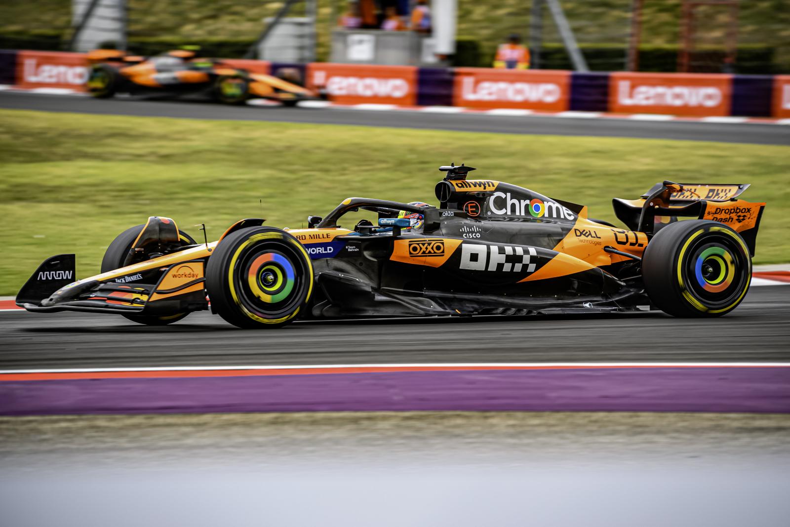 A vezetést így az egy kerékcserével tervező Norris vette át, mögötte Leclerc, Piastri, Russell volt a sorrend. Nem sokáig maradt azonban ez az állás, a jelentős mértékben lelassuló Leclerc-t ugyanis utolérte és feltűnően könnyedén megelőzte Piastri.