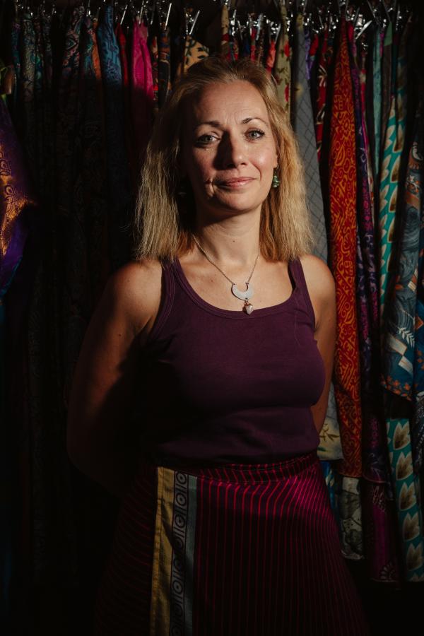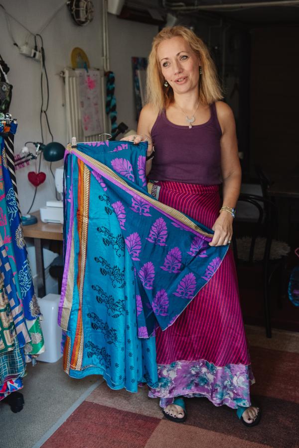 – Nem is olyan rég, a tavaszi nap-éj egyenlőségkor indítottam el a webshopomat. Májusban egyszer csak szembejött, hogy vásárra keresnek árusokat, jelentkeztem. Onnét meg szokás szerint épültek az ismeretségeim – kezdi mesélni Dóri, akinek ragyogó személyisége, közvetlensége mágnesként vonzza a standjához az embereket. És persze az újrahasznosított indiai szárikból készült színes szoknyái (lásd keretes írásunkat), amikre már messziről felfigyeltünk a Dürer kerti Boszorkánybazáron. Bár elsőre a szemünk választja ki az egyéniségünkkel, színvilágunkkal (szerintünk) harmonizáló ruhadarabot, egész más élmény, amikor felpróbáljuk. Amikor ellenállhatatlan vonzást érzünk, az lesz az igazi. Pedig lehet, hogy sosem hordunk lilát, vagy évek óta nem viselünk szoknyát, és itt történik egy varázslat, ami szinte olyan, mint a szerelembe esés.