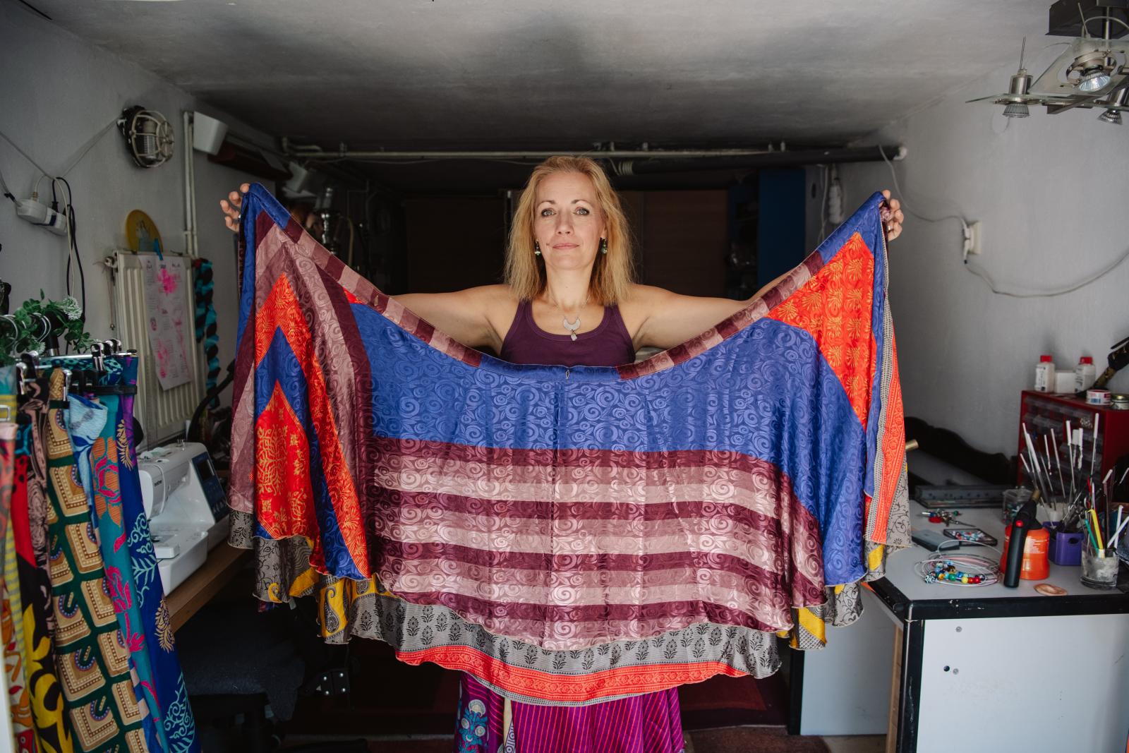 Amikor megvettük ezt a lakást, és kiderült, milyen komoly gondok vannak vele, én akkor kezdtem el lejárni ide az utca végére edzeni, hogy a feszültséget oldjam. Itt végül olyan jó közösség jött össze, tényleg egy baráti társaság, hogy wellnessezni járunk együtt tizenhatan. Ezek miatt mondom, hogy nagy mázlista vagyok. Maga a száriötlet is onnan jött, hogy volt egy elakadásom, amikor teljesen letiltottam magam, tehát egyáltalán nem tudtam dolgozni több hónapon át. Akkor döntöttem el, hogy kitanulom a webshoptervezést, és közben csak jönni fog, hogyan tovább. Elvégeztem a tanfolyamot, de nem volt olyan termék, amiről úgy éreztem volna, én ezt tudnám képviselni. Közben beléptem száriszoknyás csoportokba Facebookon, és magával ragadott az egész. Egyszer csak jött, várj, hadd mutassam meg – húz elő egy különleges szoknyát –, szóval ő volt nekem az első szerelem. Pedig a sárga abszolút nem én vagyok, de ez így, együtt, teljesen. Ezt amúgy nem én varrtam, hanem rendeltem a netről. Egyszer csak azon kaptam magam, hogy bontogatom szét és varrom újra a szoknyákat.