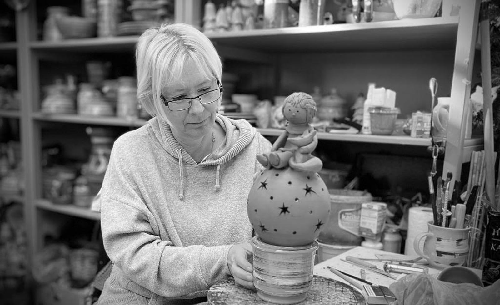 „Az érettségi évében még nem tudtam, mi szeretnék lenni, de bevillant, hogy én bizony porcelánfestő leszek. Nagyon szerettem festeni, ezért egy újsághirdetés hatására felbátorodtam, és jelentkeztem a porcelánfestés akkori fellegvárába azzal az eltökélt szándékkal, hogy én bizony kitanulom ezt a mesterséget. A felvételin szembesültem azzal, hogy kizáró ok a balkezesség, mert nincsen baloldali könyöklős munkaasztal, vagyis panget. Sírva tettem le a ceruzát felvételin, még csak bele sem kezdtem a munkába. Ahogy az épület kerengőjében próbáltam magam összeszedni, odajött hozzám a portásnéni, átölelte a vállamat, és vigasztalt. „Ne sírj, hogy balkezes vagy, legyél inkább fazekas!” Fazekas?! – gondoltam. Azt sem tudtam, mit csinál, de a néni bogarat ültetett a fülembe, utánaérdeklődtem, és megtetszett az ötlet. Eljutottam Pista bácsihoz, akiről tudta egy ismerősöm, hogy fazekas. Dr. Pardy István Szentesről költözött Füredre, ő csinálta a híres, szentesi, fekete kerámiát. Nagy levegőt vettem, bekopogtam hozzá. „Jó napot kívánok, szeretném megkérdezni, mit dolgozik egy fazekas?” Beinvitált, és mivel jogászdoktor volt eredetileg, roppant jól kommunikált, pillanatok alatt beavatott a részletekbe, öröm volt hallgatni a történeteit a kerámiákról. Hazamentem, fejemben zsongtak a meséi, meghánytam-vetettem, amit hallottam tőle. Néhány nap múlva jött egy levél, hogy szeretettel vár a kemencebontásra. (Akkor veszik ki a kiégetett agyagfigurákat a kemencéből – a szerk.) Elmentem, segítettem az öreg mesternek, miközben összekormozódtam. Elmentem a mosdóba, ahol egy picike tükör volt a falon. Kézmosás közben belenéztem, és megláttam, hogy háromszög alakban fekete az orrom. Akkor döntöttem el, hogy igen, én fazekas leszek.”