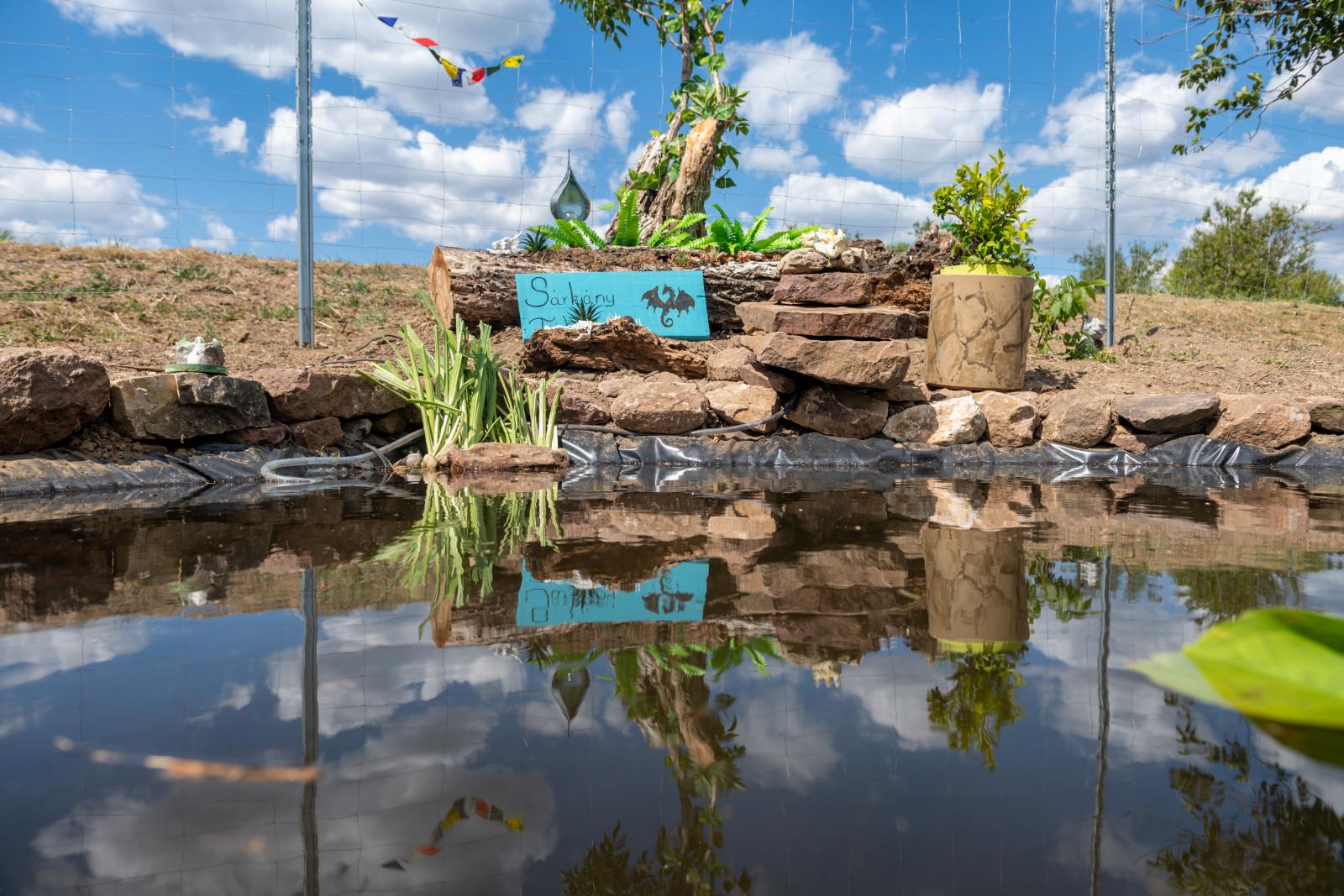 Azóta készültem a Zánkától pár kilométerre fekvő Tagyon-hegyre, hogy Bräutigam Enikő, a Skanzen PanorámaPlacc Art Café & Bar alapító-tulajdonosa először mesélt nekem csillogó szemmel a sárkányfog alakú háromszögtelekről, három út találkozásánál, hangulatos présházakkal pöttyözött balatoni szőlőhegyek között. Ahol nem csupán frissítőt és finom falatokat kínálnak az utazóknak, csupa helyi hozzávalóból, megfizethető áron, de egy szabadtéri galériát is megnézhetünk, vagy akár családunkkal részt vehetünk az egyik ásványkarkötő- vagy mandalakészítő, családállító vagy meseterápiás workshopon. Lehet itt a Sárkány Tükre-tó partján meditálni, felidézve, amikor pár száz évvel ezelőtt még idáig ért a Balaton, és kívánságot megerősíteni a vízbe dobott kis obszidiánkaviccsal, vagy a hintaágyban pihenve egy papírcetlire kiírni magunkból, amit kimondani sem merünk, és bedobni a Vallomások ládájába, hogy szombatonként – a levéltitkot tiszteletben tartva – elégessék ezeket, egyszerre akár több ezer darabot.
