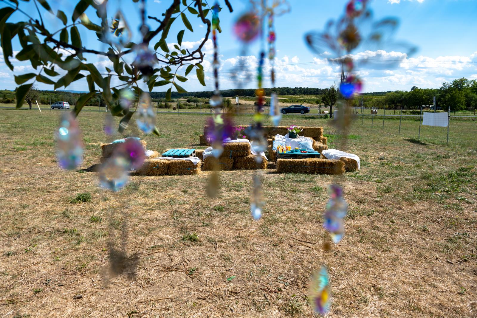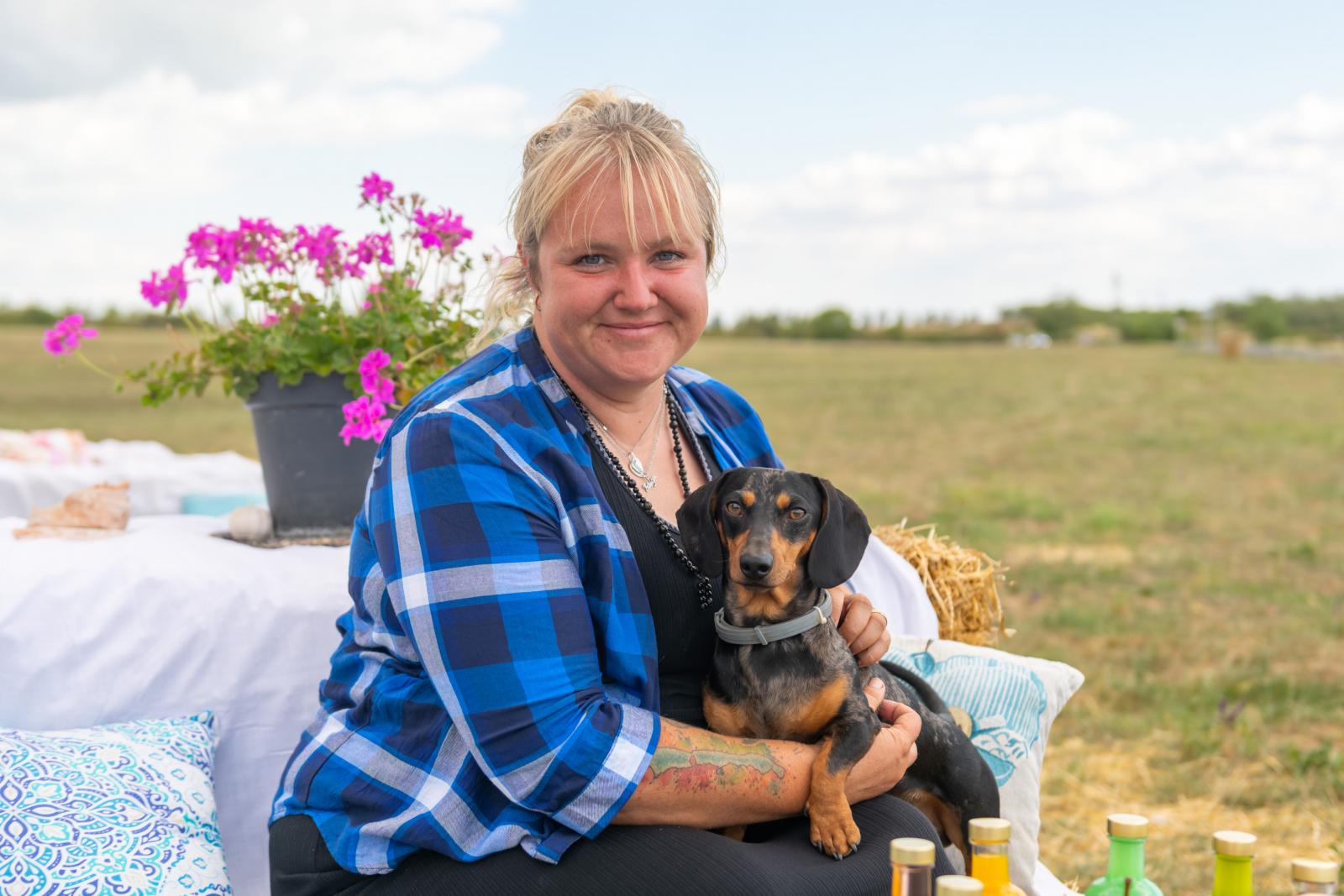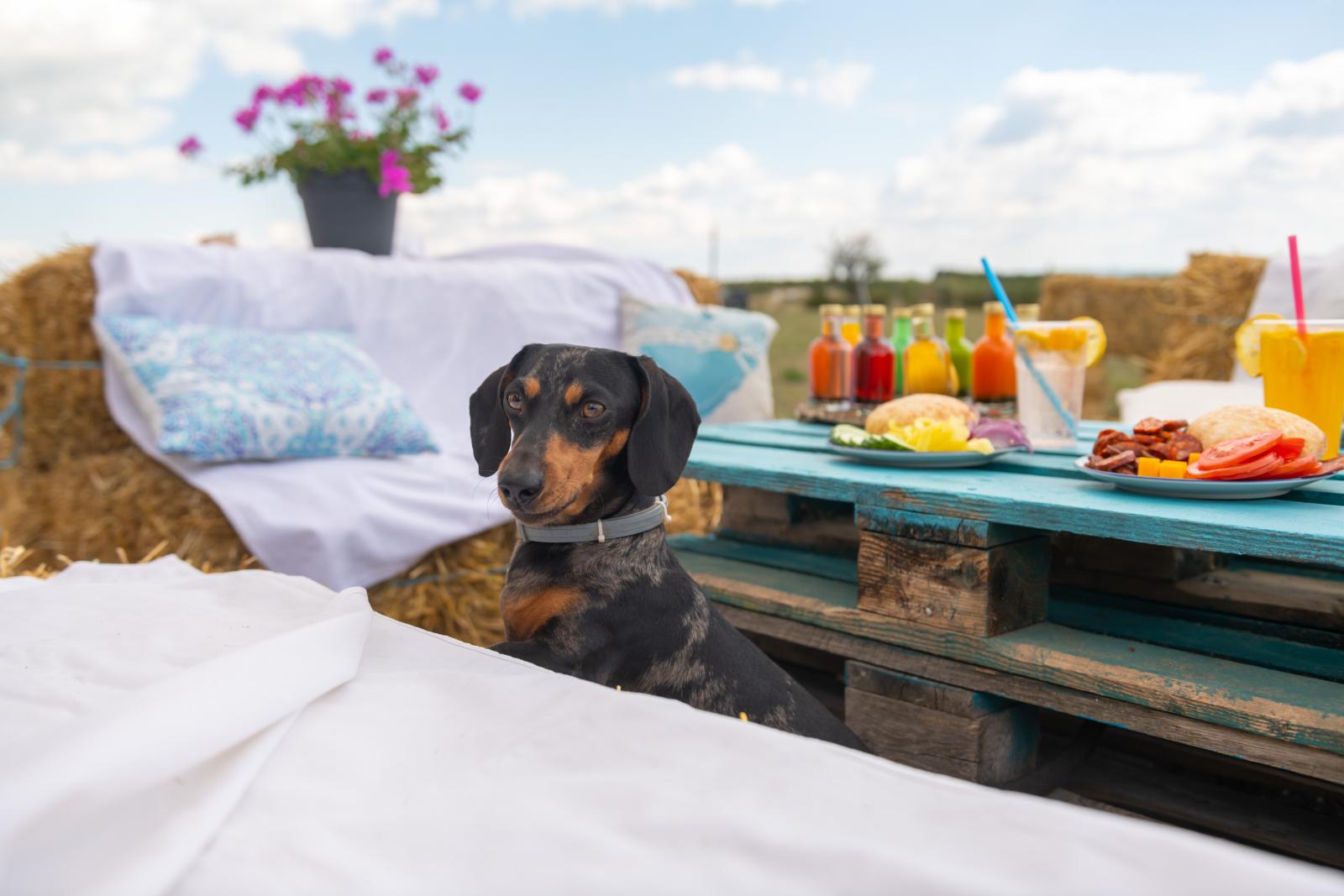 Leülünk a kényelmes szalmabálákra, kóstoljuk a finomságokat, miközben a szél a Balaton illatát lengeti felénk. A lábunk alatt sertepertél Tobi, Enikő mentett tacskója, akinek ez a hely a rengeteg illatával, tágas szabad terével szintén maga a földi paradicsom.