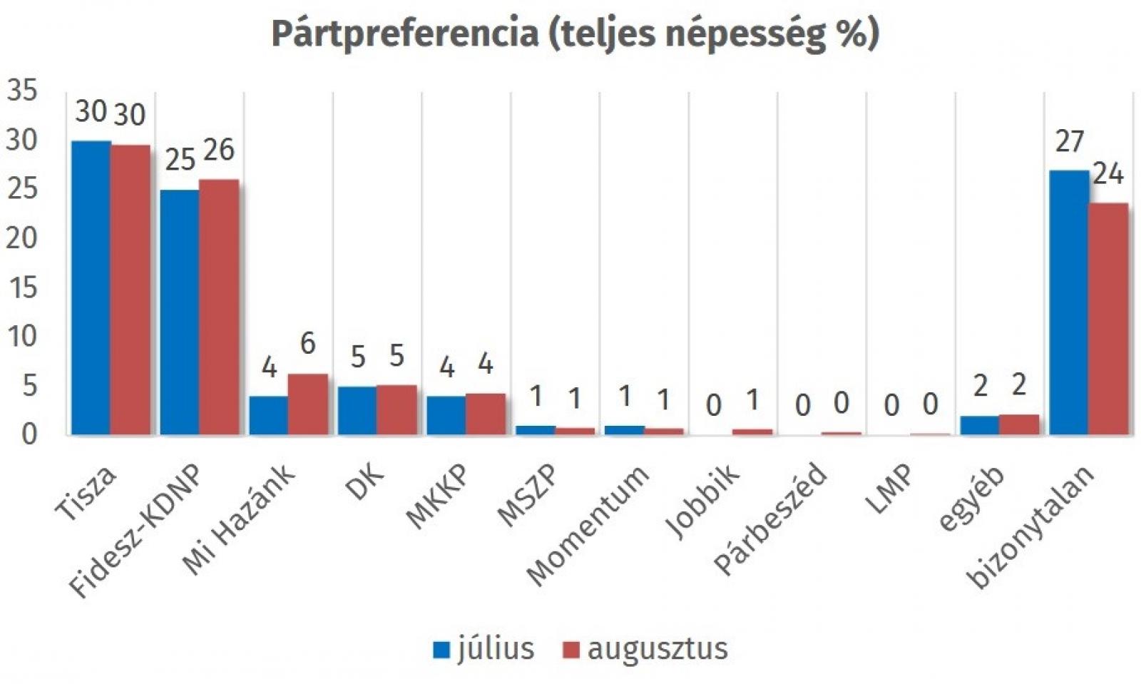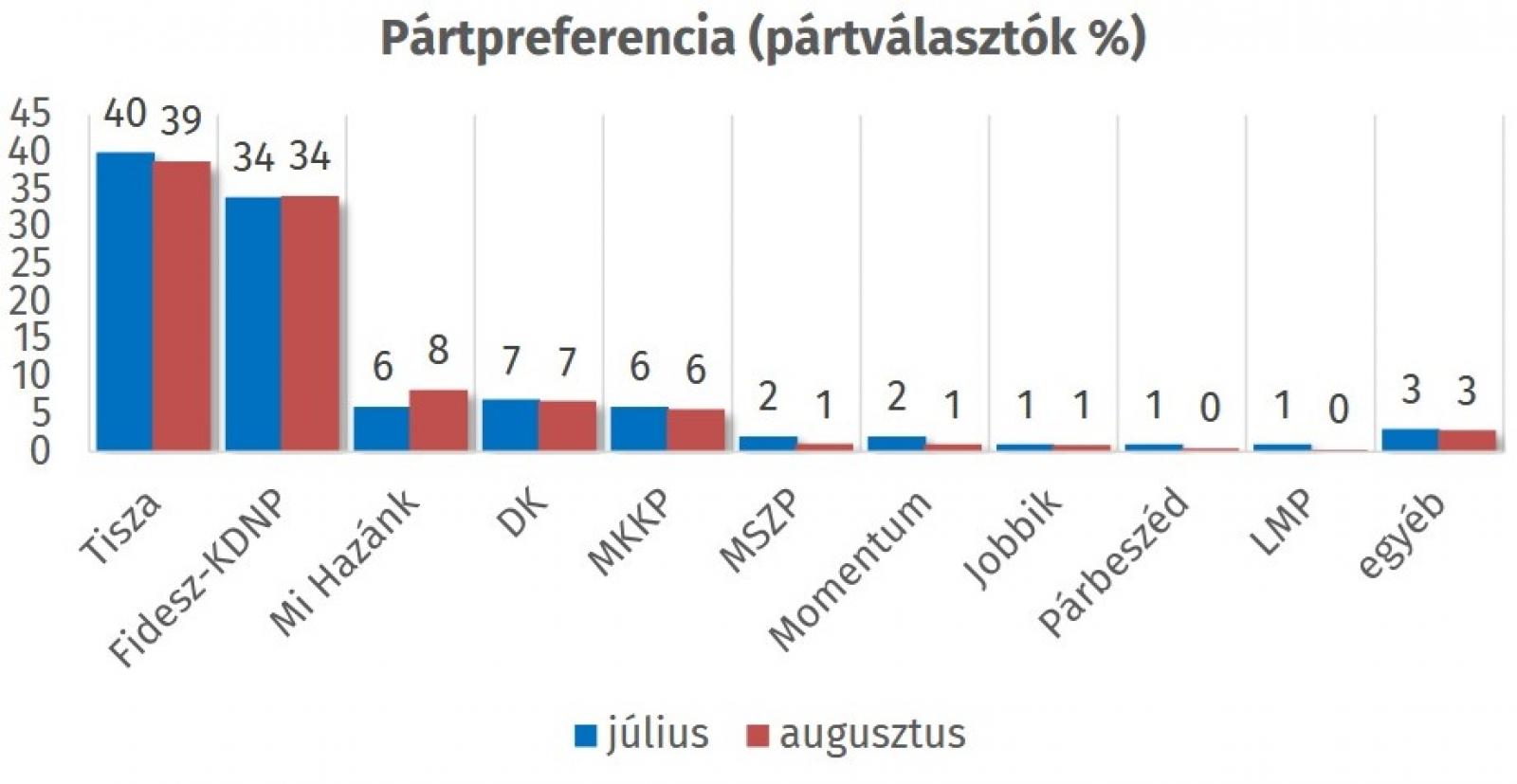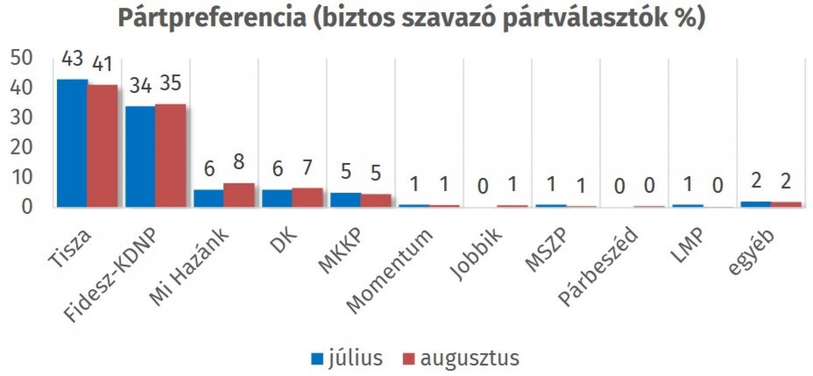Hibahatáron belül változtak a pártok közti erőviszonyok augusztusban: 4 százalékponttal vezet a Tisza Párt a Fidesz-KDNP előtt a teljes népesség körében, 5 százalékponttal a pártválasztók között és 6 százalékponttal a biztos szavazó pártválasztók csoportjában. Az állás a teljes népesség körben 30-26, a pártválasztók körében 39-34, a biztos szavazó pártválasztók között 41-35 Magyar Péter pártja javára – derül ki a Republikon Intézet 2025. augusztus 21. és 27. között készült kutatásából.