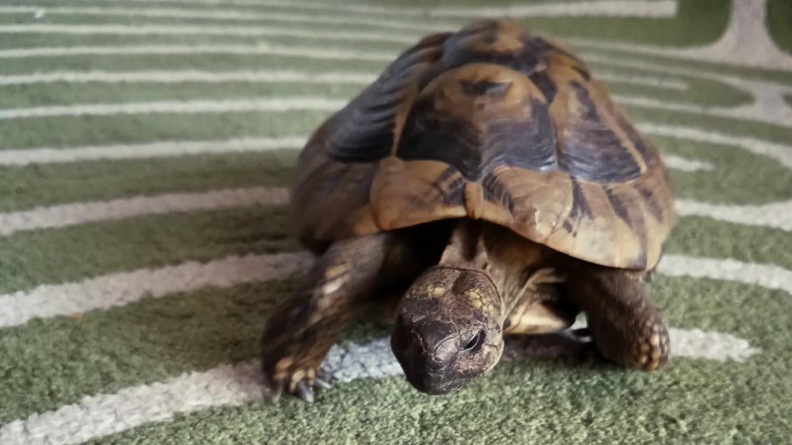Amikor odaértem és megláttam, tátva maradt a szám, mert tényleg óriási volt a kis ékszerteknősökhöz szokott szemeimnek. Megkérdeztünk pár járókelőt, hogy esetleg elvesztettek-e mostanában egy teknőst? Kicsit bolondnak néztek minket, de hát az ember tudakolózik, ha már egy ekkora teknőst talált, aki éppen a síneken akart átkelni a túloldalra. Pár házba is becsengettünk, de senkinek nem hiányzott az új haverunk. Úgyhogy hazahoztuk. Egy ideig a társasházunk kertjében mászkált, egyáltalán nem félt, legelte a fűvet. Vizet is adtunk neki, de az nem nagyon érdekelte.