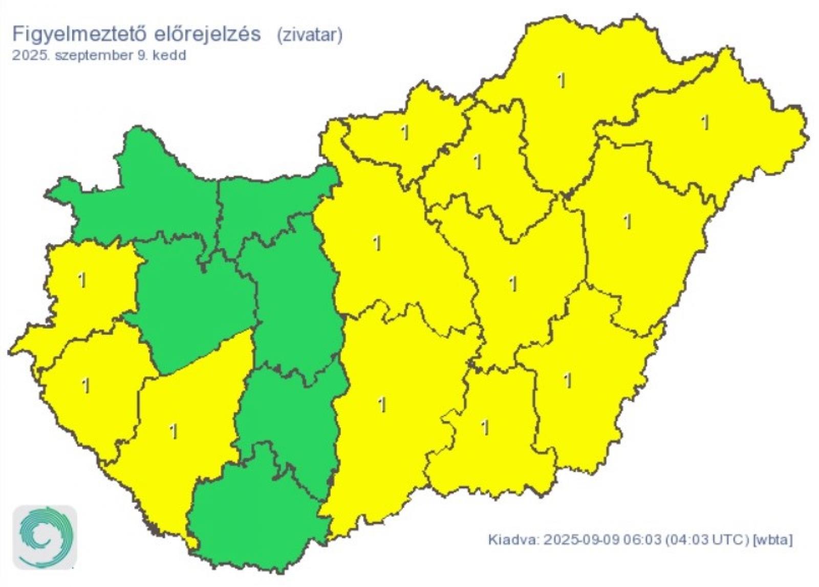 A várható zivatarok miatt tizenhárom vármegyére (Pest, Bács-Kiskun, Békés, Borsod-Abaúj-Zemplén, Csongrád-Csanád, Hajdú-Bihar, Heves, Nógrád, Somogy, Szabolcs-Szatmár-Bereg, Jász-Nagykun-Szolnok, Vas és Zala) elsőfokú figyelmeztetést adtak ki.