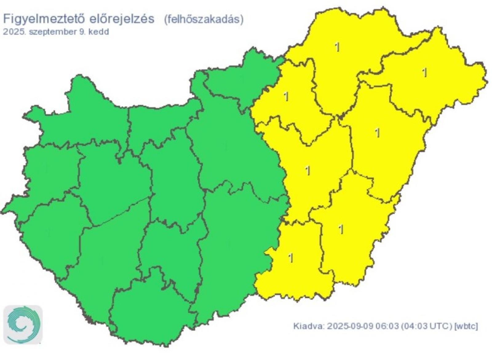 Békés, Borsod-Abaúj-Zemplén, Csongrád-Csanád, Hajdú-Bihar, Heves, Szabolcs-Szatmár-Bereg és Jász-Nagykun-Szolnok vármegyében felhőszakadásra is figyelmeztetnek:
