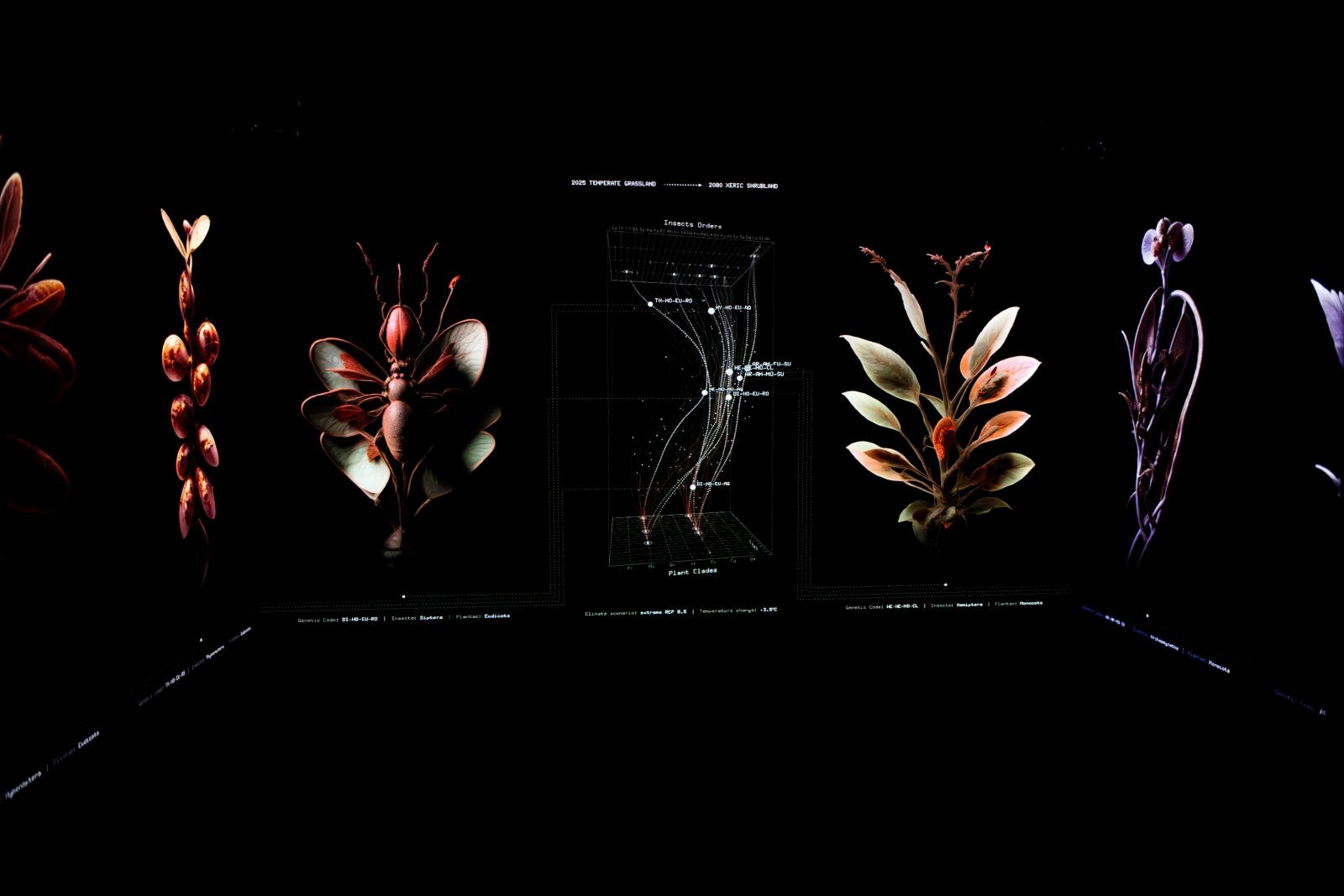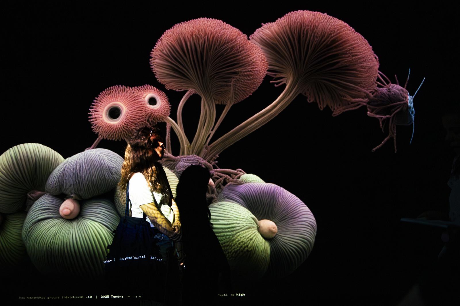 Mat Collishaw brit művész Alpha Omega című munkája egy vitrinbe helyezett űrhajós sisak, melynek plexijén csimpánzok tükröződnek, akik tapogatják és kopogtatják azt, míg a sisak belsejében egy emberi koponya képe dereng fel, így jelezve, hogy nem minden utazás végződik happy enddel. Collishaw egy másik művében, egy három csatornás videóinstallációban pedig egy vízalatti világot látunk, melyben elképzelt lények úszkálnak, miközben a testük folyamatosan alakul, mivel nehézfémek, mikroműanyagok és ipari hulladékok között kell élniük – a látvány egyszerre szemet gyönyörködtető, de bizarr is. A fuse* nevű alkotó Mimikri című művében is egyfolytában változnak a szereplők, melyek részben növény, részben rovar hibridek – a szürreális alkotás a mesterséges intelligencia segítségével készült.