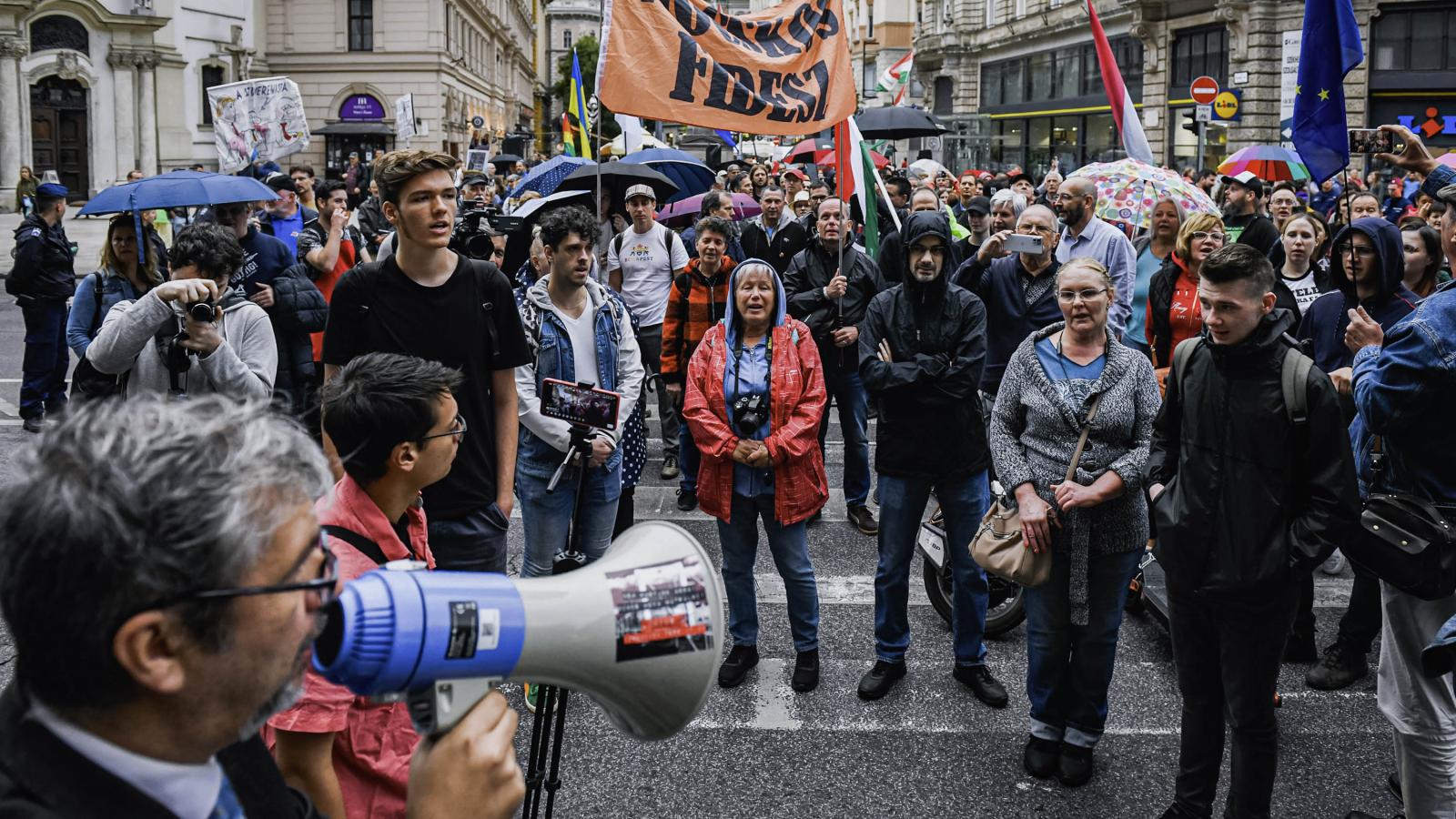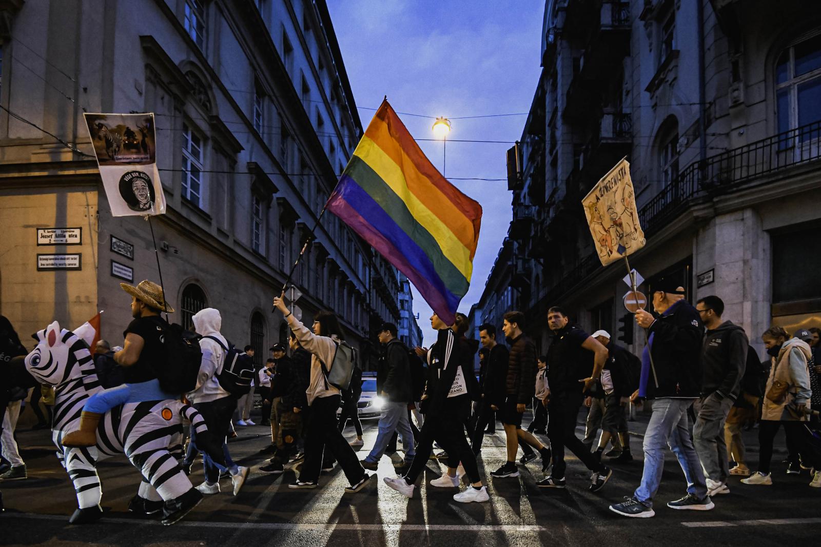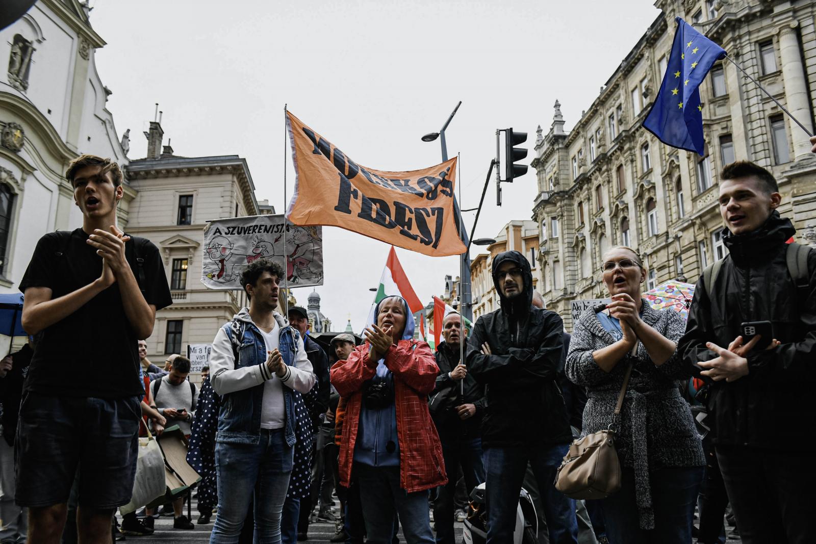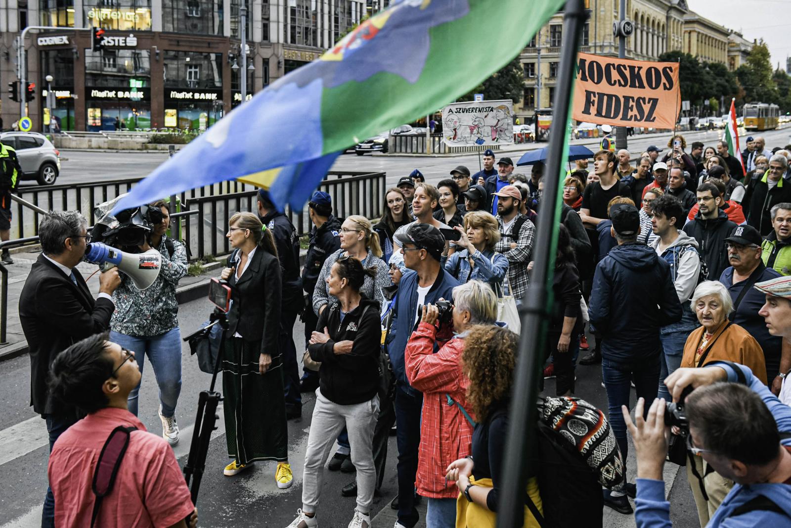 Na még egy pár fekete autó? Mocskos Fidesz! - kiabálta egy fiatal tüntető a Ferenciek tere mellett elhaladó állami konvojsor felé kedd délután. Hadházy Ákos vezetésével ezúttal mintegy 110-en gyűltek össze, hogy a Pride-ot betiltó „technofasiszta”, és az átláthatóságinak nevezett ellehetetlenítési törvény visszavonását követeljék.