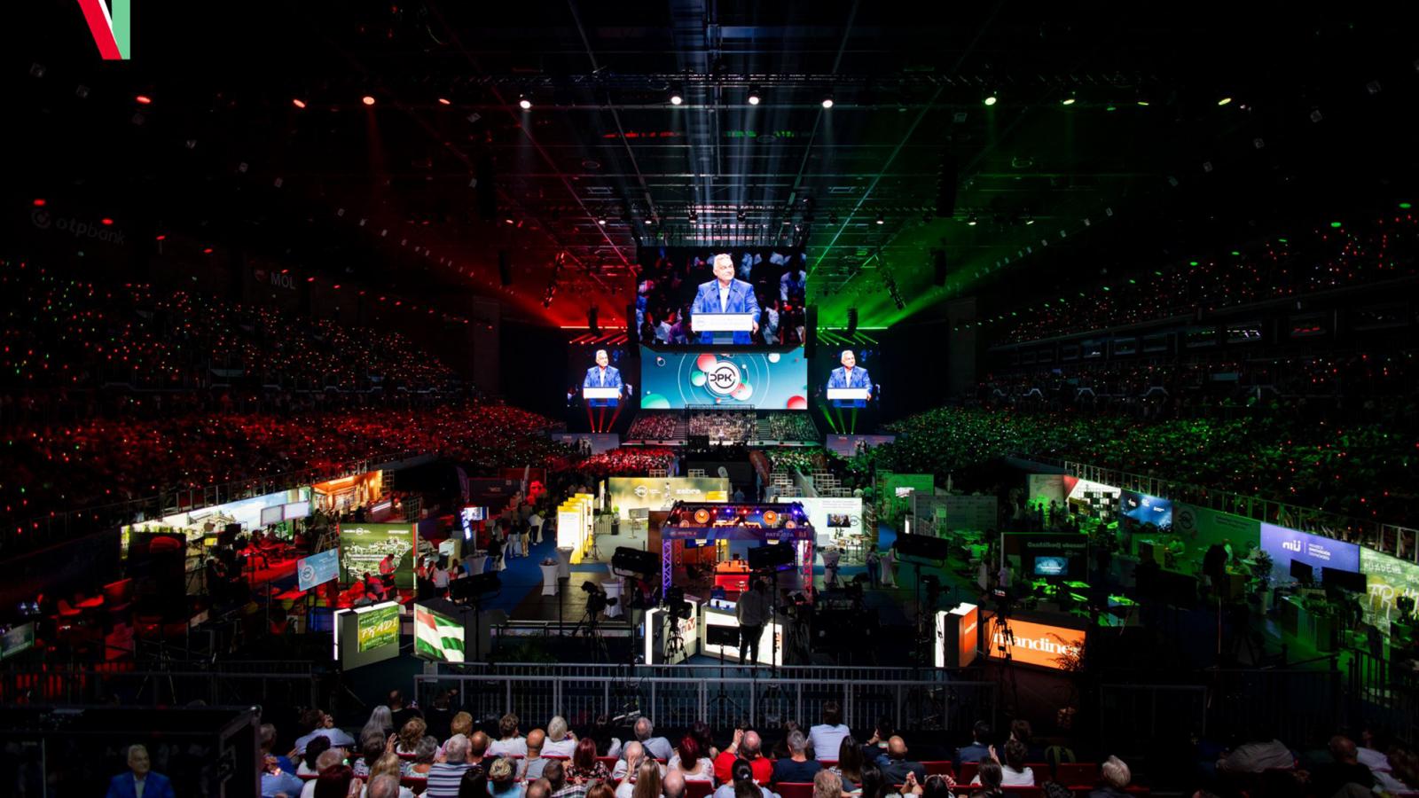 Az est fénypontjaként színpadra lépett miniszterelnök azonban nem elsősorban hozzájuk szólt. Ő a tavaly jól bevált amerikai republikánus recept szerint a „Tegyük naggyá Magyarországot!” jelszóval, valamint egy október 23-ra tervezett békemenet bejelentésével a jelenlévőket, a „kemény mag” legkeményebb részét alkotó hallgatóságot lelkesítette. Sikerrel tehette ezt, hiszen kívánsága – „mi, magyarok azt akarjuk, hogy Magyarország és mi, magyarok nagyok legyünk és gazdagok” – a teremben ülők egy része számára máris teljesült. Kérdés, elhitethető-e a szavazótábor nagyobbik részével, hogy ami az utóbbi tizenöt évben „a pénzügyi válság, a migráció, a covid és a háború miatt” nem sikerült, vagyis az ország nagyobbik részének felemelése legalább a „hanyatló Európa” szintjére, most majd sikerülni fog.