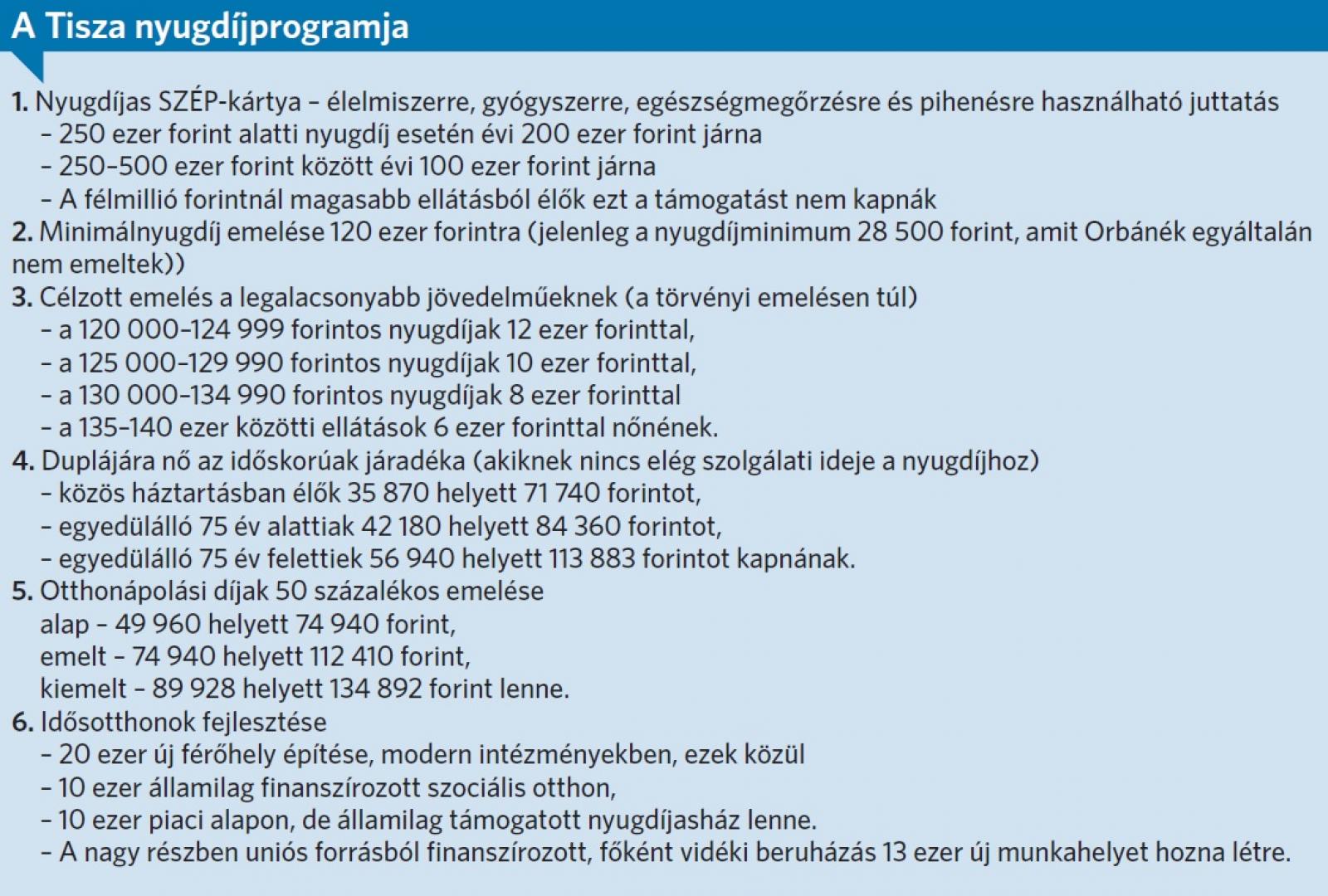 A legszegényebb idősek felzárkóztatása után valós inflációkövető, illetve gazdasági növekedéshez kötött emeléseket vezetnének be. Beszélt arról is, hogy a szakmai kérdésekbe bevonják majd a szakmai – és érdekképviseleti szervezeteket, velük egyeztetve döntenek majd például arról, hogy a Szép-kártyás összeget csekken, vagy inkább plasztikkártyán érdemes eljuttatni az érintettekhez. Mint mondta, a program költségeit az ötmilliárd forint feletti magánvagyonokra kivetett vagyonadóból, az uniós források lehívásából, valamint a kormánypropaganda kiadásainak lefaragásából fedeznék.