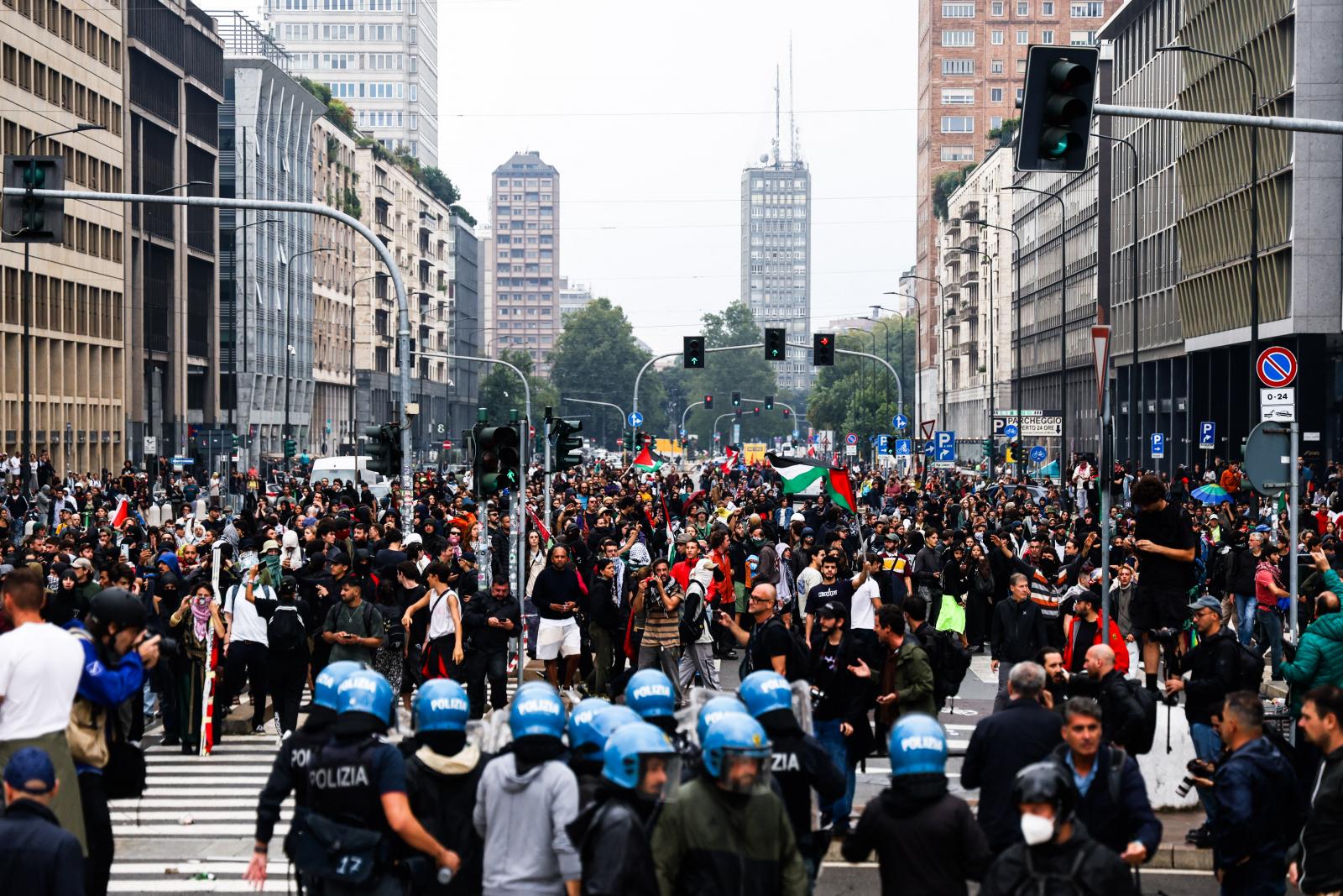 Milánóban hétfőn éppen az egyik kiemelt városrészben palesztinbarát tüntetők csoportjai megrohamozták a központi pályaudvar épületét, ahonnan rohamrendőrök szorították őket vissza. Az utcai harc tüntetők és rendőrök között több órán át tartott. Hatvan rendőr szorult kórházi ellátásra, öt tüntetőt vettek őrizetbe.