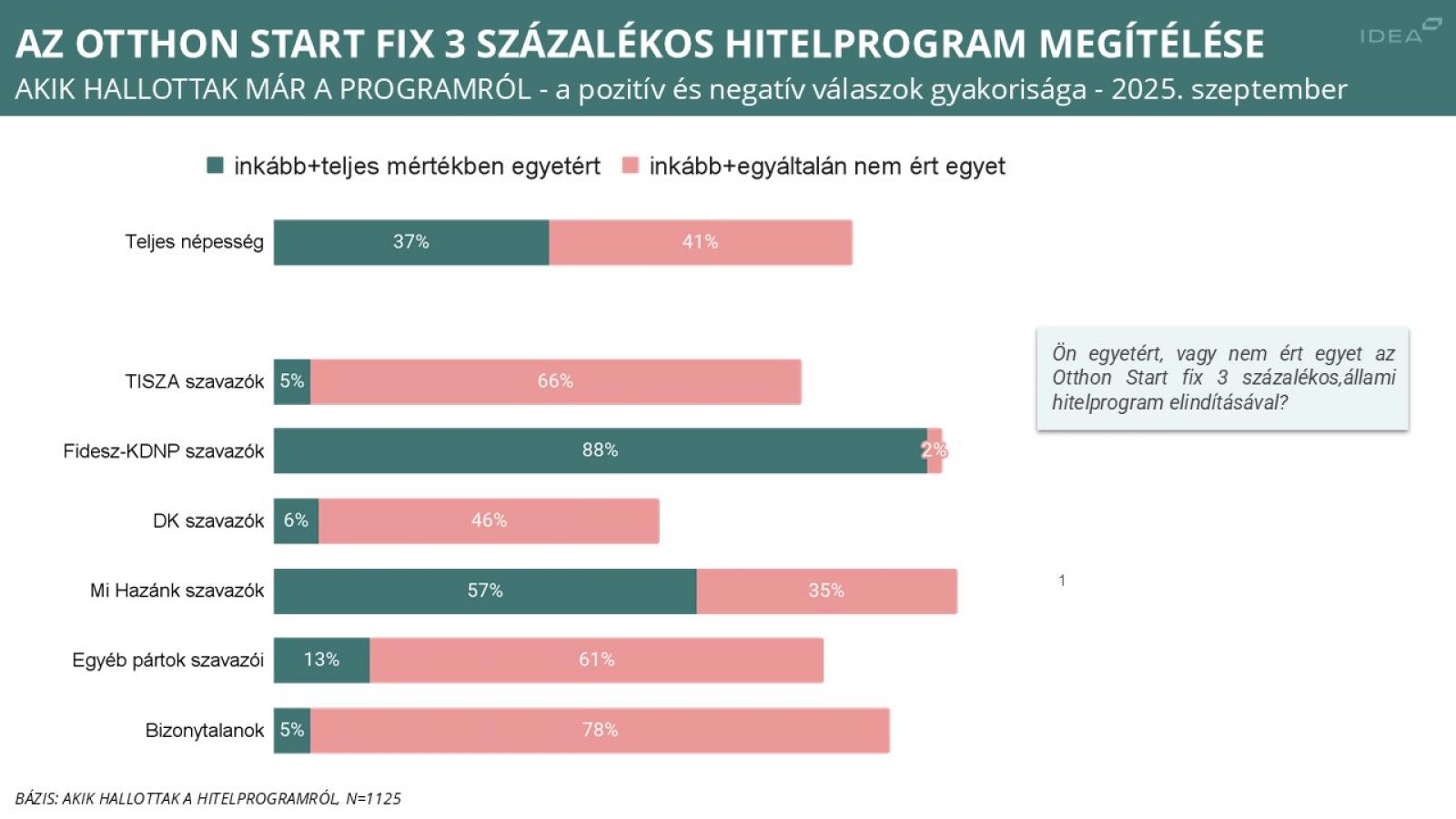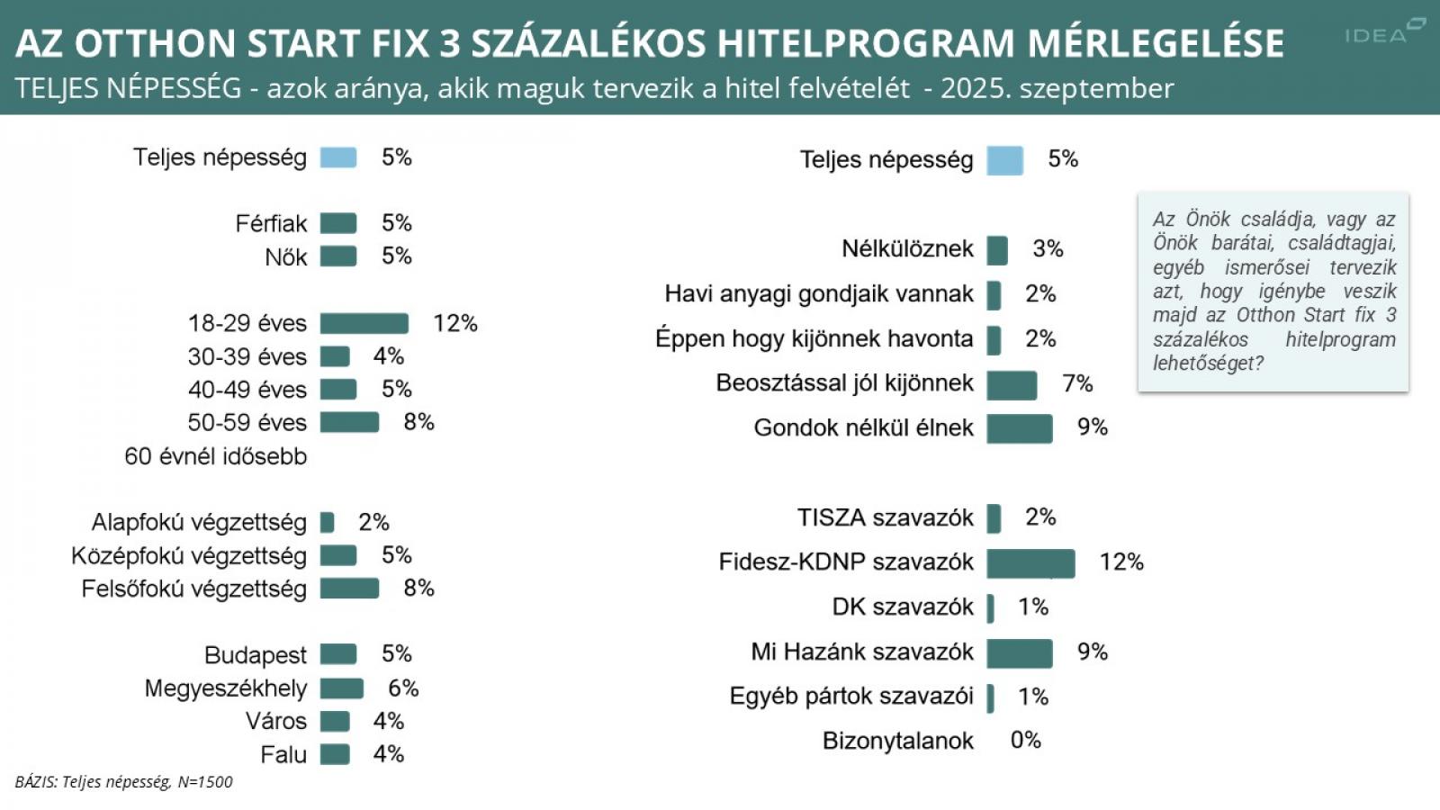 Az Otthon Start fix 3 százalékos, állami támogatású hitelprogram első, konkrét banki ajánlatai szeptember elején jelentek meg. A banki ajánlatok mérlegelésének lehetősége előtt a népesség 5 százaléka (főleg a jobb anyagi helyzetben lévő felnőttek) gondolta úgy, hogy valószínűleg élni fog a program által nyújtott lehetőséggel. Ekkorra a népesség háromnegyede hallott már valamilyen információt az Otthon Start Fix programról, amelynek megítélése megosztja a társadalmat – derül ki az IDEA Intézet augusztus 31. és szeptember 6. között készített kutatásából.